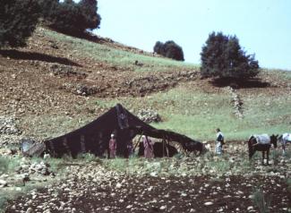 Mitten im Hohen Atlas wurden wir an einem Bergsee von Nomaden in ihre „schwarze Khaima“ eingeladen, um dort nach einem typischen Nomadenmahl mit Zicklein-Kebab, auch gleich die Nacht zu verbringen. Für die Männer war es selbstverständlich, die Einladung anzunehmen und ich wurde überstimmt. Ich hatte ziemlich Angst davor zwischen einer Nomaden-Großfamilie, Ziegen, Schafen, Hühnern und Hunden auf Teppichen zu schlafen, die unter und über uns ausgebreitet wurden. Allein der Staub beim Ausbreiten der Teppiche löste bei mir schon einen Hustenreiz aus. Die Verständigung mit den Nomaden erfolgte nur in Zeichensprache und in französisch-berberischem Kauderwelsch. Bereits um fünf Uhr morgens weckte uns das Bellen und die rege Geschäftigkeit der Nomaden. Schon recht früh bereiteten sich alle darauf vor, Schaf- und Ziegenherden zum Weiden zu treiben. Am Zeltpfosten neben uns war ein Zicklein angebunden und hatte sich schließlich auch etwas verheddert, Kurzerhand ließ es sich auf dem Teppich nieder unter dem Wolfgang schlief. Das wäre nicht weiter tragisch gewesen, aber es war natürlich nicht stubenrein und so pinkelte es direkt auf den Schläfer. Um ein unvergessliches Erlebnis reicher, verabschiedeten wir uns nach einem Frühstück mit frischem Fladenbrot und Minztee von den freundlichen Gastgebern.