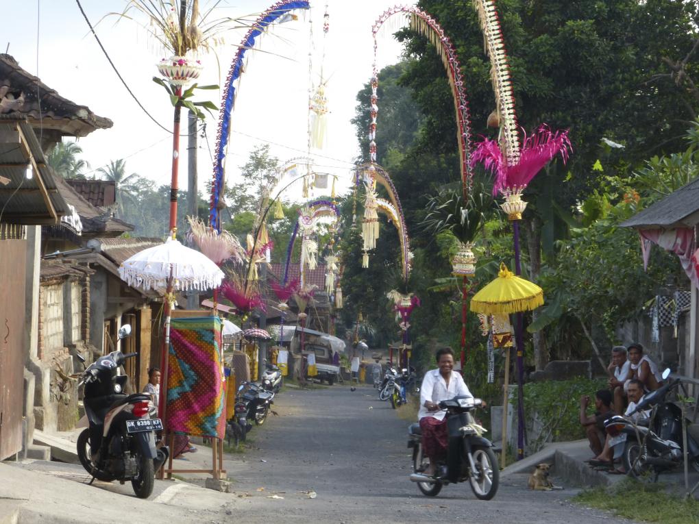 Alle 210 Tage wird auf Bali Galungan, das aufwendigste und interessanteste Tempelfest Balis, gefeiert und ganz Bali strahlt wie ein blitzblankes, funkelndes Schmuckstück. Jede Dorfstraße ist geschmückt mit einer Allee von Penjors, das sind mehrere Meter hohe aufwändig dekorierte Bambusstangen, die jede Familie vor ihrem Gehöft aufbaut. Wenn Galungan naht, ist jede balinesische Familie schon Tage vorher ausgesprochen sibuk (beschäftigt). Für dieses Fest steht der normale Alltag fast still. Geschäfte werden nur noch wenige Stunden geöffnet, Banken und Ämter sind nur an wenigen Tagen erreichbar.