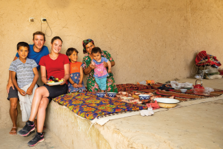 Nicht minder kräftezehrend, wenn auch ohne Magendrücken: die Steppe Usbekistans. 42 Grad lähmen, schon morgens tropft der Schweiß von der Stirn ins Müsli. An einer Lehmhütte wollen wir nach ein paar Litern Wasser betteln, denn der Dorfbrunnen scheint längst versiegt. Wasser wird von Tankwagen geliefert. Kinder flitzen uns entgegen, die Mutter hinterher. Sie füllt die Trinkflaschen zum Überlaufen und drängt uns ins Haus. Schnell ist die Suppe angerichtet, dazu Brot, Obst auf Teller gestapelt. Nein, nur mit Wasser lässt man uns nicht fort: Ohne Mittagessen dürfen wir nicht weiter.