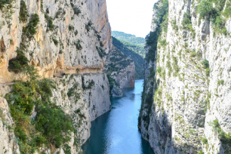 Kurz vor der französischen Grenze gönnen wir uns noch ein ganz besonderes Highlight: die Mont-Rebei-Schlucht! Hinter einem türkisfarbenen See wird der Fluss immer schmaler und schmaler und führt schließlich durch eine enge aufregende Schlucht. Wir wandern vier Stunden entlang der Felsen, über Geröll und eine wackelige Hängebrücke. Eine wundervolle Wanderung, die uns noch lange im Gedächtnis bleiben wird.