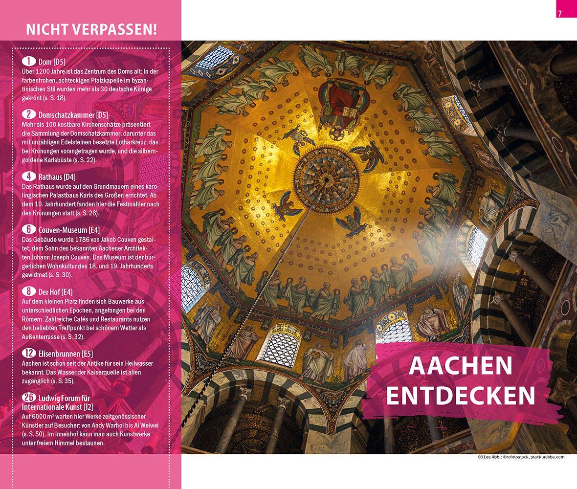 Grenzmetropole im Dreiländereck, Kurort, Studentenstadt – Aachen hat viele Gesichter. Der Dom und die Domschatzkammer ziehen Pilger aus aller Welt an, wenn bei der Heiligtumsfahrt die berühmten Reliquien präsentiert werden. Auf dem Marktplatz, gesäumt von Cafés und dem historischen Rathaus, herrscht immer reges Treiben. Events wie das Pferdesportfest CHIO und der Karneval bieten vielfältige Unterhaltung, während der Park am Elisenbrunnen, aus dem Heilwasser sprudelt, eine Oase der Ruhe mitten in der Stadt bildet. Ein Ausflug führt in den idyllischen Ortsteil Kornelimünster, wo der beliebte Eifelsteig-Wanderweg startet. Vom Dreiländerpunkt aus hat man eine phänomenale Aussicht auf Deutschland, Belgien und die Niederlande.