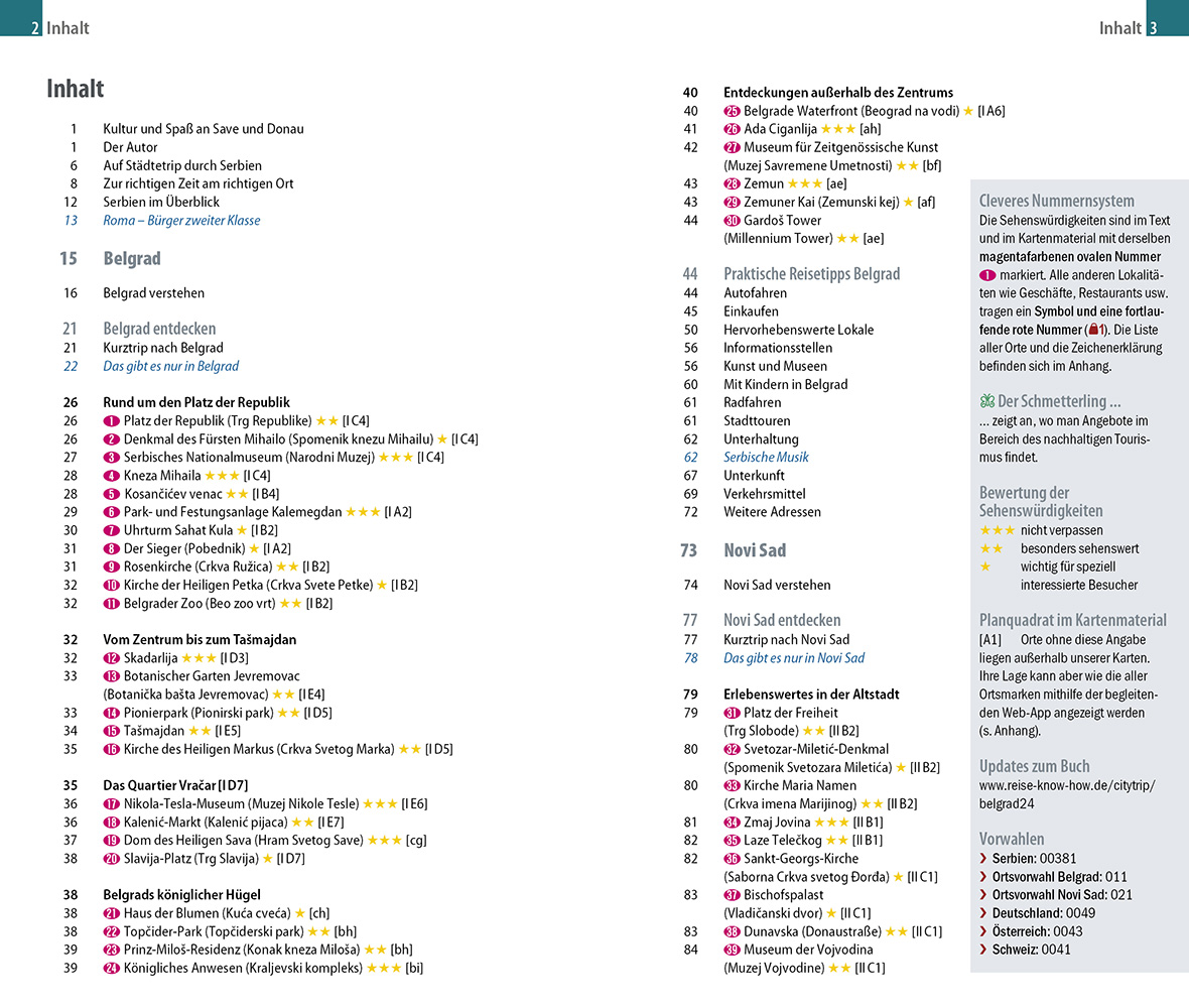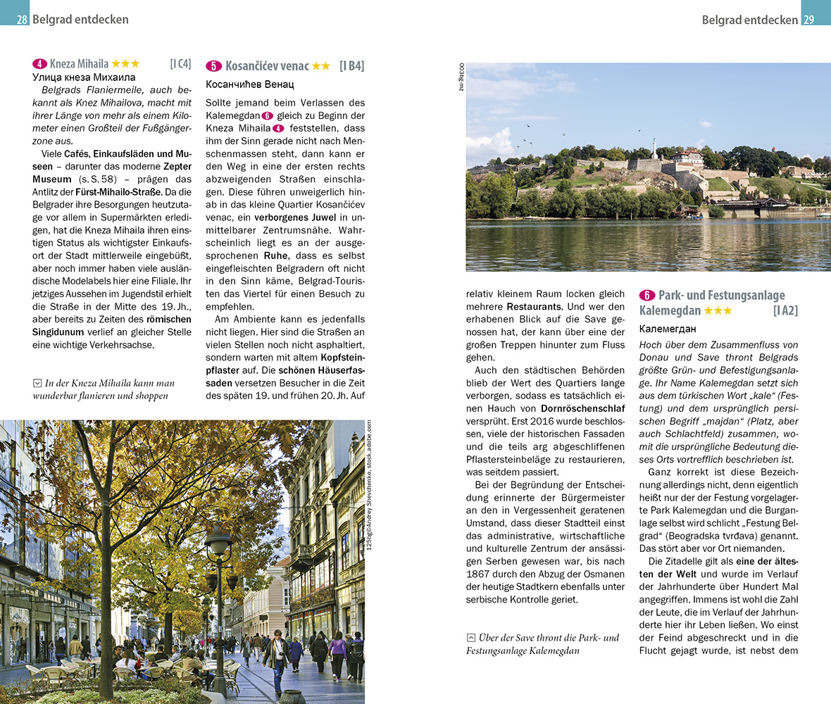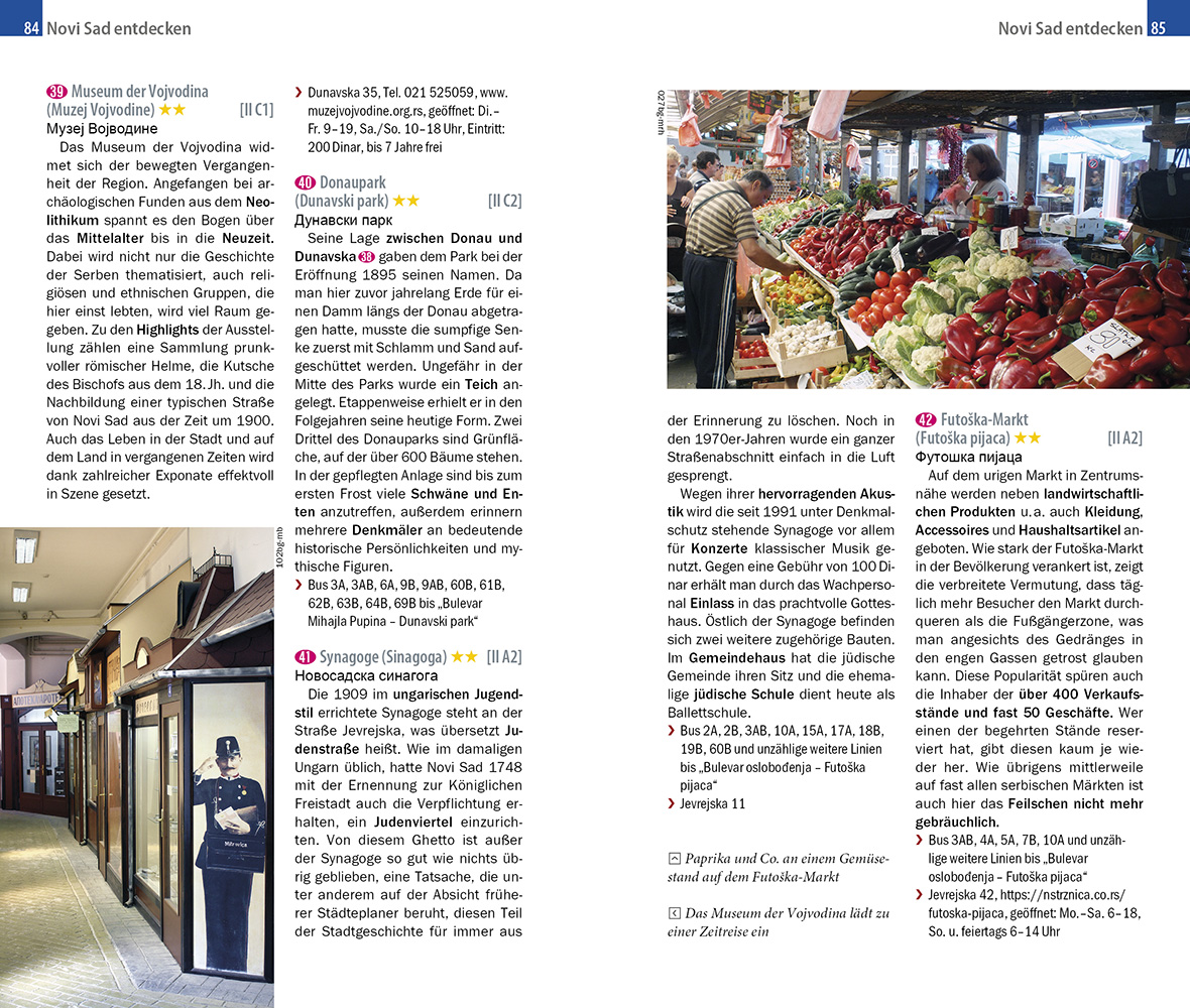 Die beiden größten serbischen Städte Belgrad und Novi Sad eint ihre Lage an der Donau und ihre bunte Kulturszene. Über beiden thront eine geschichtsträchtige Festung, von deren Mauern man einen grandiosen Ausblick genießt. Das dynamische Belgrad punktet mit einem lebendigen Nachtleben, in das man etwa in der Ausgehmeile Skadarlija oder auf den Splavovi genannten Partybooten eintauchen kann. In Novi Sad, der Hauptstadt der Vojvodina, verheißen die versteckten Passagen der Altstadt Shoppingfreuden. In der Umgebung von Novi Sad locken Salaši, urige Landgasthöfe, mit deftiger serbischer Küche. Die orthodoxen Klöster der Fruška Gora zeichnen sich hingegen durch Stille und Spiritualität aus.