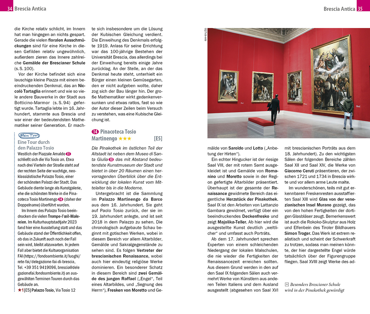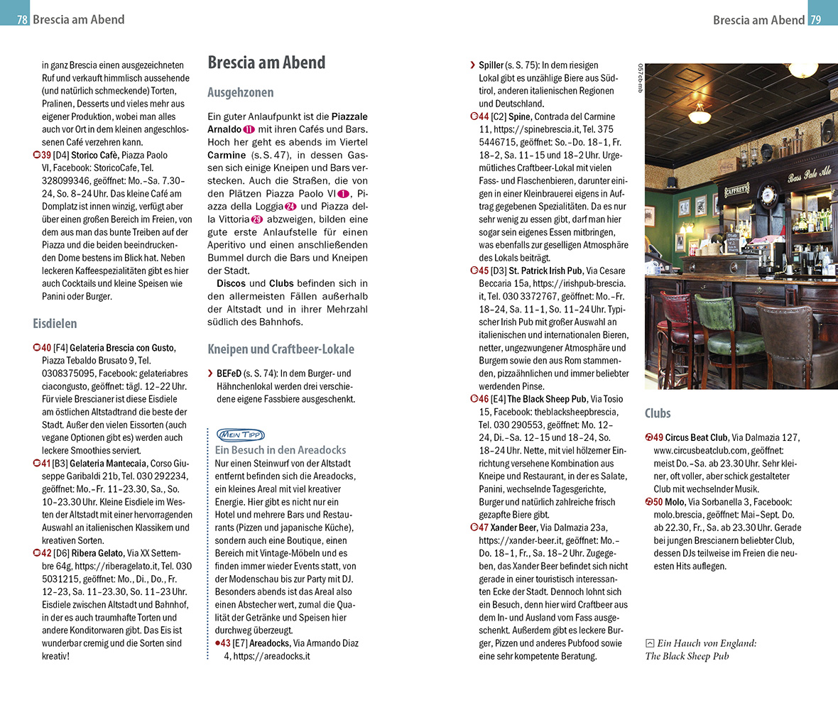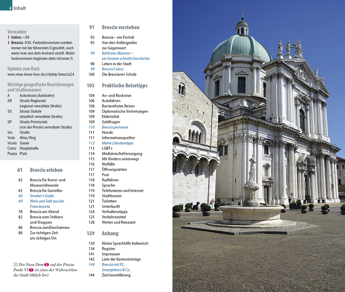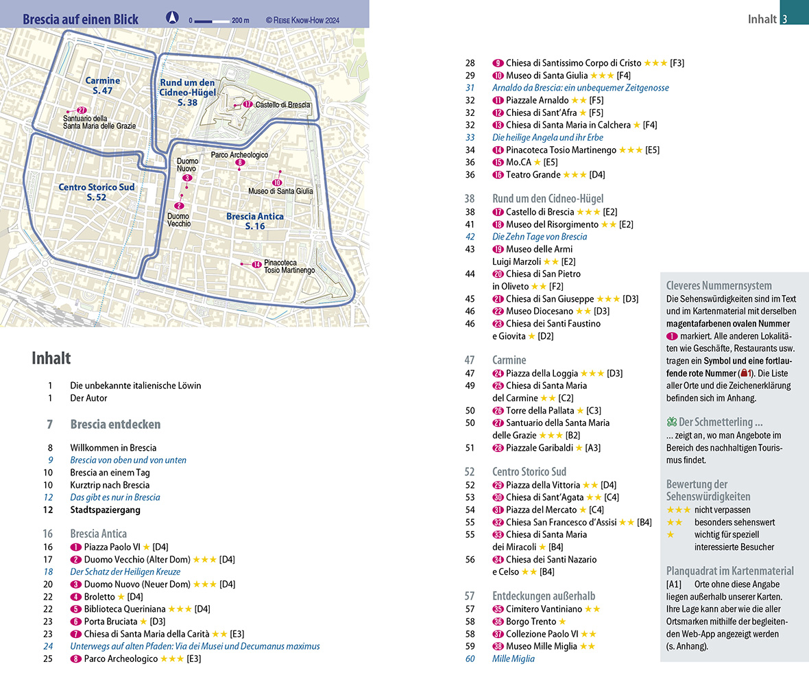 Dieser Band aus der Reihe CityTrip bietet alle notwendigen Informationen für einen Trip nach Bresia und bietet mit dem für die Reihe üblichen großen City-Faltplan schnelle und kompakte Orientierung: Auf dem beiliegenden City-Faltplan sind mit Nummern die Sehenswürdigkeiten verzeichnet, die dann im Reiseführer unter denselben Nummern erläutert werden. Wie üblich nach Regionen bzw. Stadtteilen gegliedert werden alle Sehenswürdigkeiten überschaubar mit Sternchen nach ihrer Bedeutsamkeit bewertet und beschrieben und im Inhaltsverzeichnis mit Quadrate-Nr auf dem Stadtplan zusätzlich verortet (z.B. D4) .