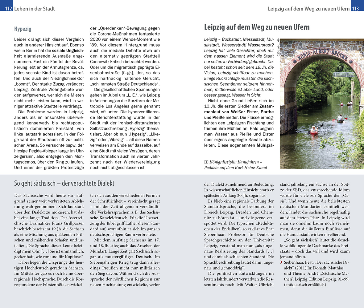 Die Messestadt, die Buchstadt, die Musikstadt oder die Universitätsstadt, der Schauplatz der Völkerschlacht oder der Ausgangspunkt der Wende, Klein-Paris oder Klein-Venedig – welches Leipzig darf es sein? Das ebenso geschichtsträchtige wie innovative Leipzig zeigt sich seinen Gästen in so vielen Facetten wie nur wenige andere Städte. Das kulinarische Angebot ist ebenso vielschichtig wie die kulturelle und künstlerische Szene und auch eine grüne Oase oder ein Wasserlauf ist immer in der Nähe. In der Umgebung lockt das Neuseenland, wo ehemalige Braunkohletagebaue geflutet wurden und ein herrliches Naherholungsgebiet entstanden ist.
