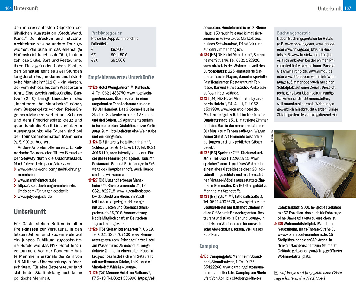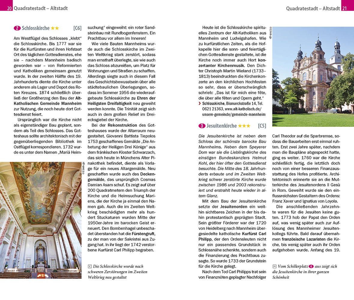 Mannheim, dessen Stadtkern keine Straßennamen, sondern Buchstaben und Zahlen als Adresse kennt, wird mehr und mehr von Reisenden entdeckt. Neben Sehenswürdigkeiten wie dem kurfürstlichen Schloss, dem Wasserturm und altehrwürdigen Kirchen punktet die Stadt der Quadrate und der Musik mit kilometerlangen Einkaufsstraßen, einem beeindruckenden Kulturangebot und dem szenigen Ausgehviertel Jungbusch. Entspannung finden Besucher wie Einheimische im Luisenpark oder entlang der Ufer von Rhein und Neckar. Bei einem Ausflug auf die andere Rheinseite kann man in Ludwigshafen eine Wallfahrtskirche, das Besucherzentrum von BASF, das Schillerhaus und das Wilhelm-Hack-Museum erkunden.