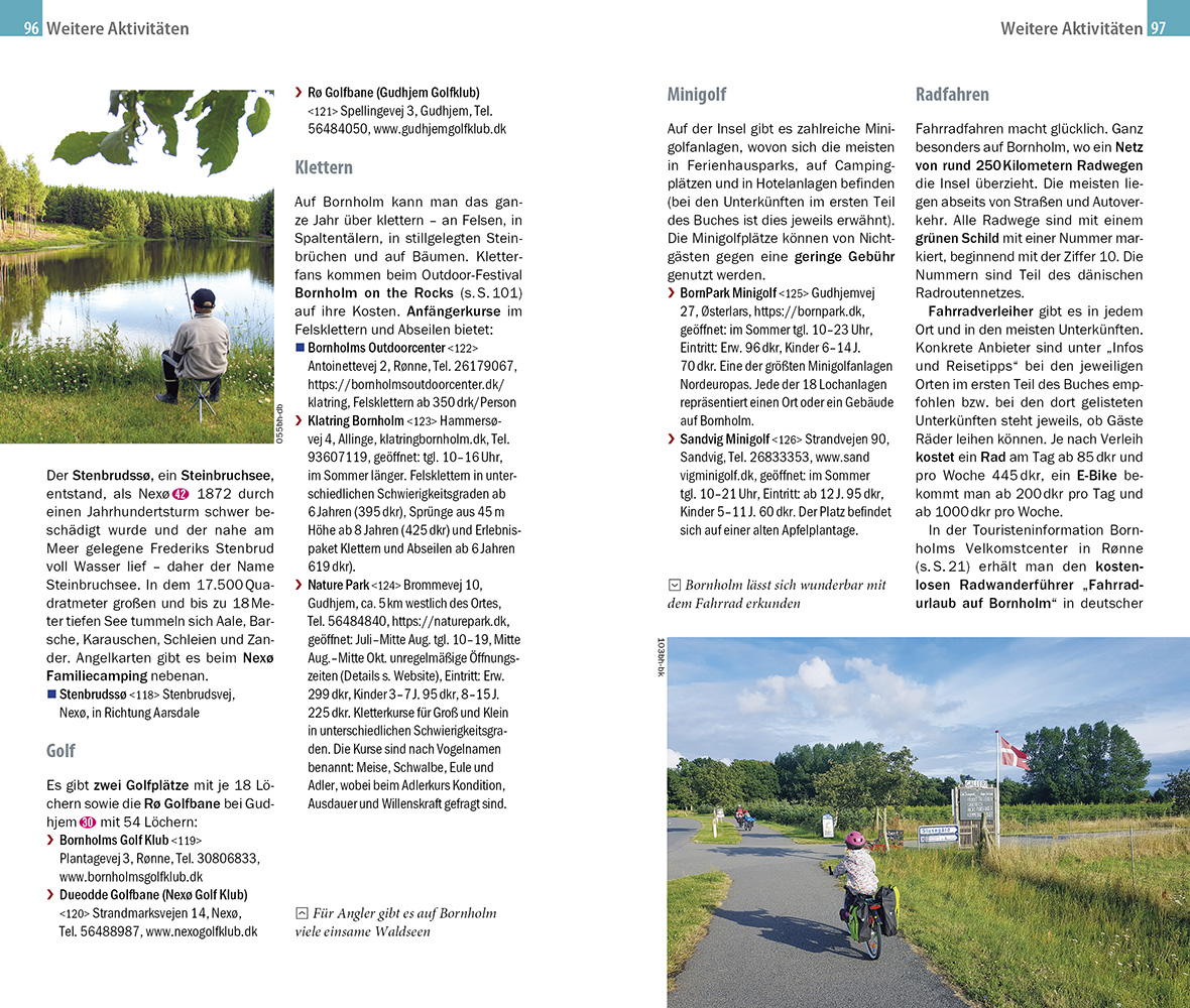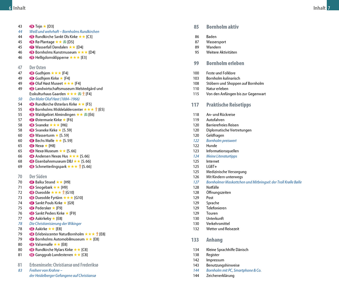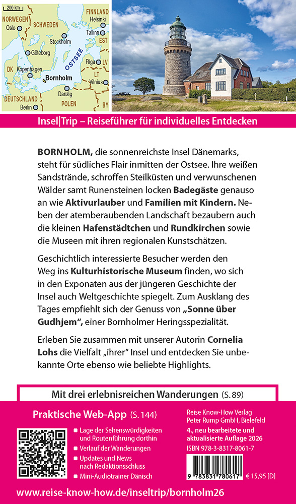 Dazu: kostenlose Web-App für Smartphone, Tablet und PC mit Inselplan- und Satellitenansichten passend zum Text, Routenführung zu allen beschriebenen Sehenswürdigkeiten und touristisch wichtigen Orten, Verlauf der Wanderungen, seitenbezogenen Updates nach Redaktionsschluss sowie einem Mini-Audiotrainer Dänisch