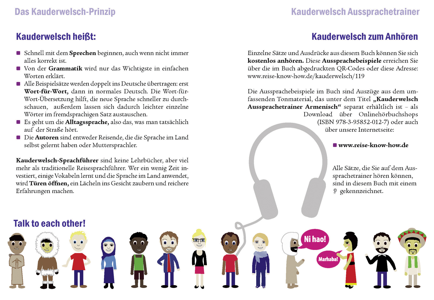 - Kauderwelsch-Bücher sind viel mehr als übliche Reisesprachführer. Ziel ist es, schon nach kurzer Zeit tatsächlich sprechen zu können, wenn auch nicht immer druckreif. Wer sich ein wenig Zeit zur Vorbereitung nimmt, kann mit Kauderwelsch auf Reisen in einen intensiveren Kontakt mit den Einheimischen treten und Erfahrungen machen, die sprachlosen Reisenden verborgen bleiben.