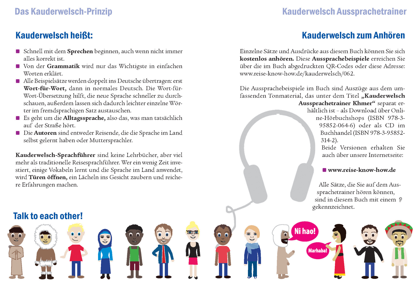 - Kauderwelsch-Bücher sind viel mehr als übliche Reisesprachführer. Ziel ist es, schon nach kurzer Zeit tatsächlich sprechen zu können, wenn auch nicht immer druckreif. Wer sich ein wenig Zeit zur Vorbereitung nimmt, kann mit Kauderwelsch auf Reisen in einen intensiveren Kontakt mit den Einheimischen treten und Erfahrungen machen, die sprachlosen Reisenden verborgen bleiben.