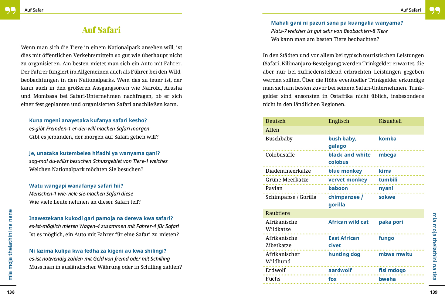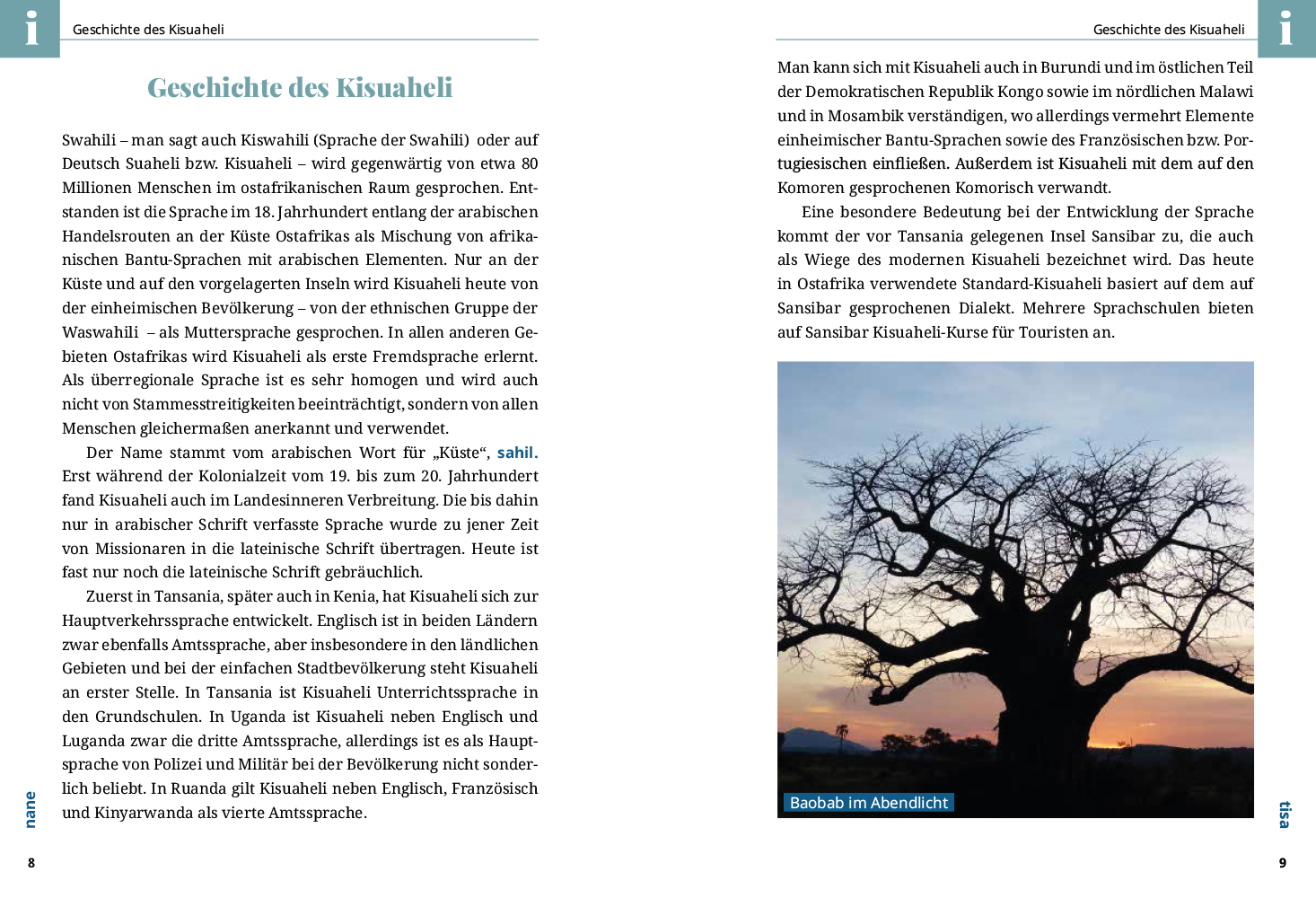 Kisuaheli (auch Swahili) wird gegenwärtig von ca. 40 Millionen Menschen im ostafrikanischen Raum gesprochen. Es ist die wichtigste Umgangssprache in Tansania (dort sogar wichtiger als Englisch), Kenia und Uganda, wird aber auch in Ruanda, Burundi und im östlichen Zaire verstanden. Weil Swahili von fast allen Ostafrikanern als erste Fremdsprache erlernt wird, tun Reisende gut daran, sich wenigstens Grundkenntnisse dieser Sprache anzueignen. Man wird sich so in den meisten ostafrikanischen Ländern verständigen können, auch wenn sich hier und da Elemente einheimischer Dialekte und französische Wörter mit dem suahelischen Wortschatz vermischen.