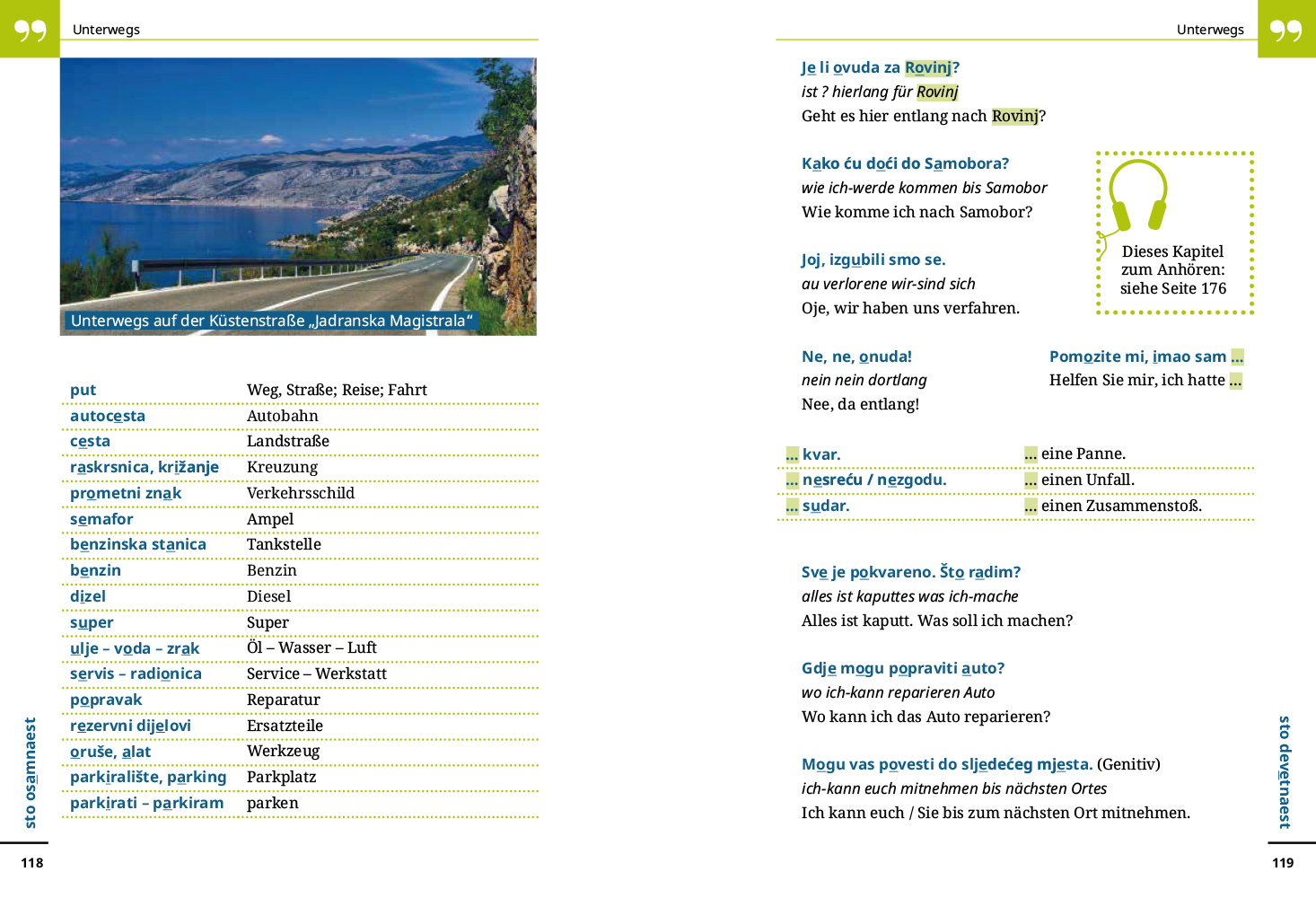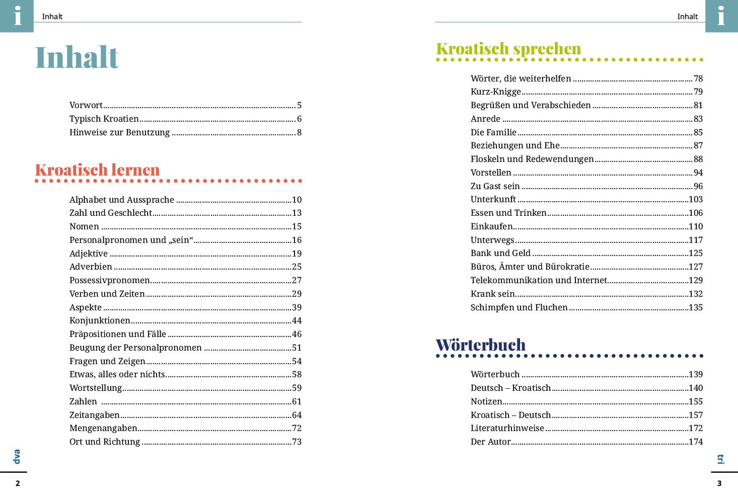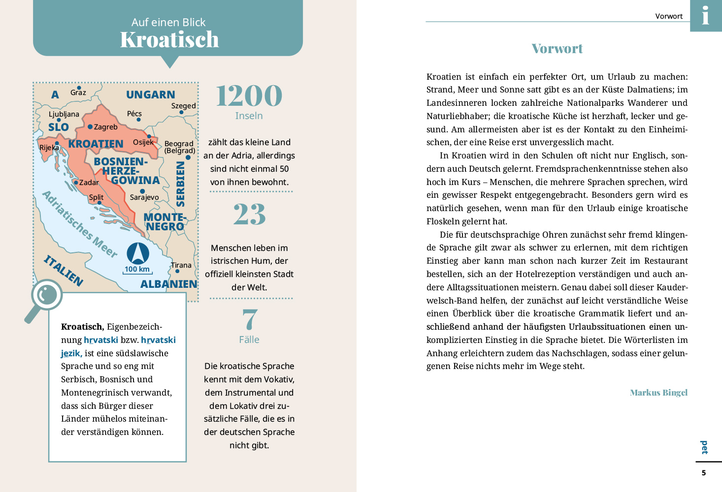 In diesem Sprachführer werden die wichtigsten Grammatikregeln erklärt, ohne zu sehr ins Detail zu gehen. Vielmehr sollen die Reisenden möglichst schnell dazu im Stande sein, eigenständig Sätze zu bilden und sich auf Kroatisch zu unterhalten. Ein Kurz-Knigge erläutert die wichtigsten Verhaltensregeln und Umgangsformen. In diesem Sprachführer ist die einheitliche Hochsprache angegeben, mit der man überall in Kroatien verstanden wird.