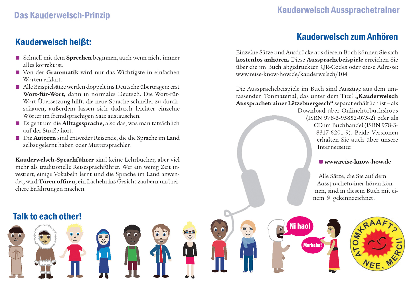 - Kauderwelsch-Bücher sind viel mehr als übliche Reisesprachführer. Ziel ist es, schon nach kurzer Zeit tatsächlich sprechen zu können, wenn auch nicht immer druckreif. Wer sich ein wenig Zeit zur Vorbereitung nimmt, kann mit Kauderwelsch auf Reisen in einen intensiveren Kontakt mit den Einheimischen treten und Erfahrungen machen, die sprachlosen Reisenden verborgen bleiben.