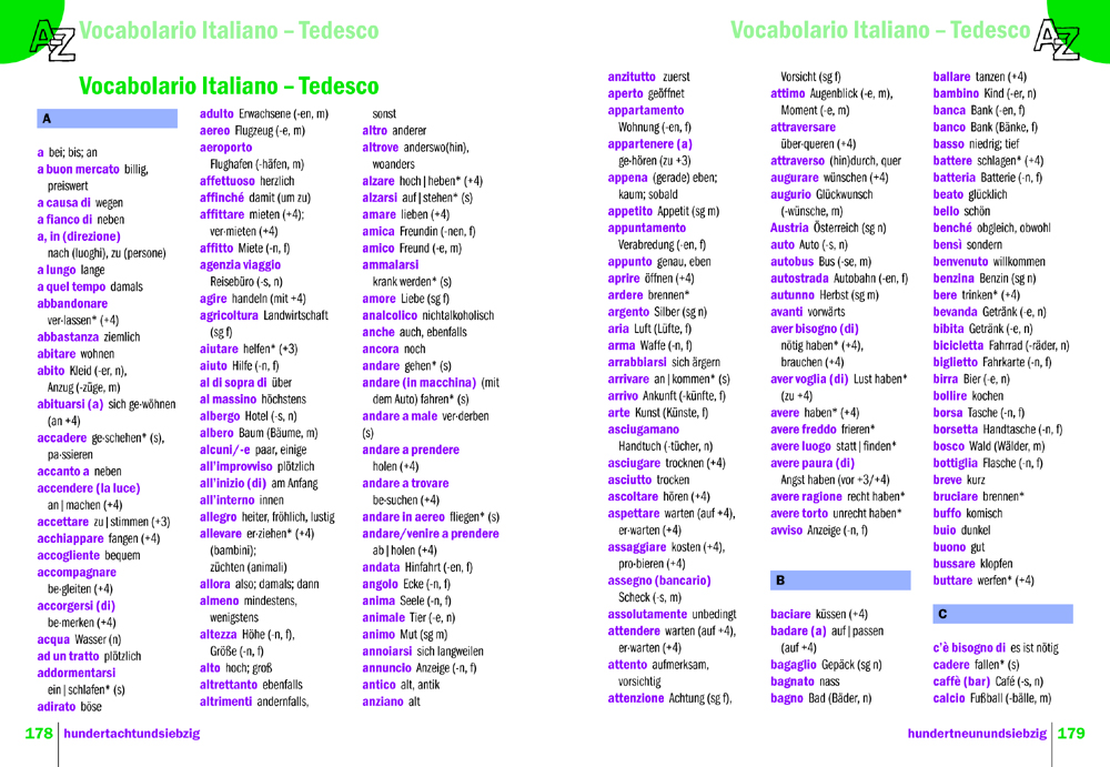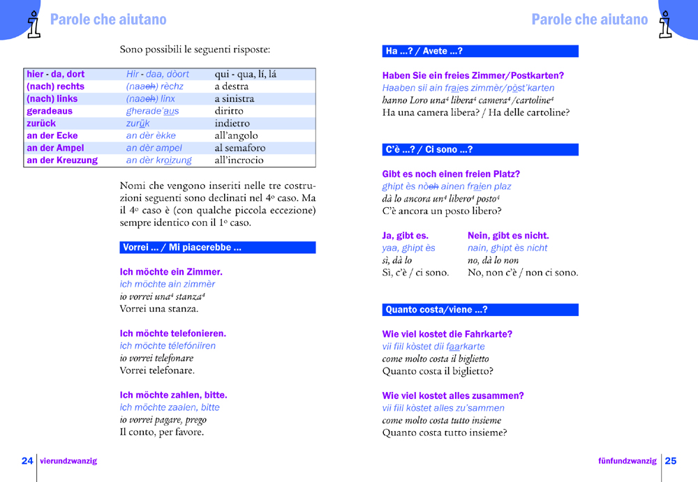- Tutte le frasi vengono tradotte in italiano due volte: da una parte parola per parola, dall’altra parte in „buon“ italiano. Così il sistema della lingua straniera viene capito molto bene. In una lingua straniera diferiscono p. es. la costruzione della frase e il modo d’esprimersi molto dall’italiano. Senza questo tipo di traduzione è praticamente impossibile cambiare velocemente alcune parole in una frase.