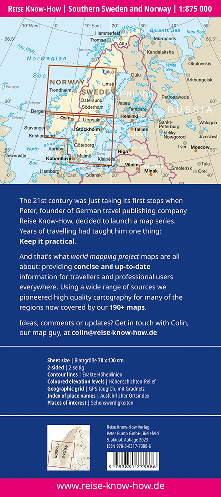 Hochreißfeste und 100% wasserfeste Landkarte „Südschweden, Südnorwegen“ aus der Serie world mapping project. Diese Karte deckt zusammen mit der Karte 'Finnland und Nordskandinavien' das gesamte Gebiet Norwegens, Schwedens und Finnlands ab.