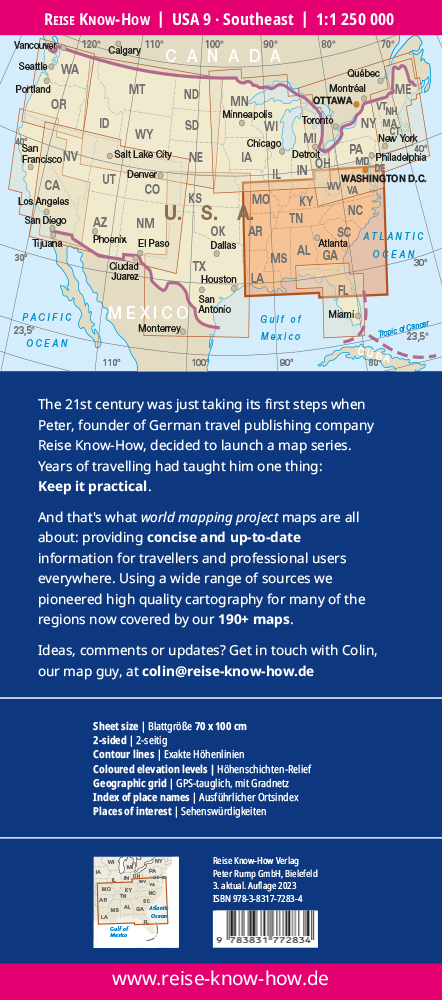 Reise Know-How Landkarten zeichnen sich durch besonders stabiles Kunststoffpapier aus, das beschreibbar ist wie Papier, sogar mit Bleistift. Der Pappumschlag ist abnehmbar, so dass sich die Karte bequem in jede Tasche stecken lässt. Eine Schutzhülle ist nicht erforderlich. Die kartografische Darstellung konzentriert sich auf die wichtigsten Informationen für Reisende und ist besonders gut lesbar. Statt einer Schummerung werden farbige Höhenschichten verwendet.
