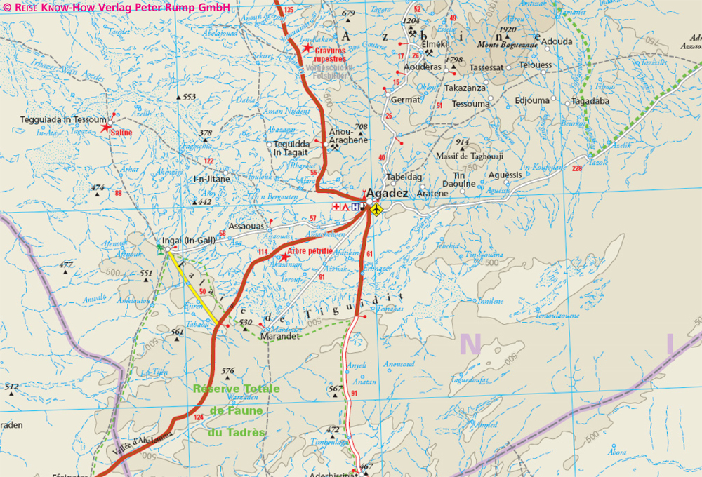 Die kartografische Darstellung konzentriert sich auf die wichtigsten Informationen für Reisende und ist besonders gut lesbar. Statt einer Schummerung werden farbige Höhenschichten verwendet.