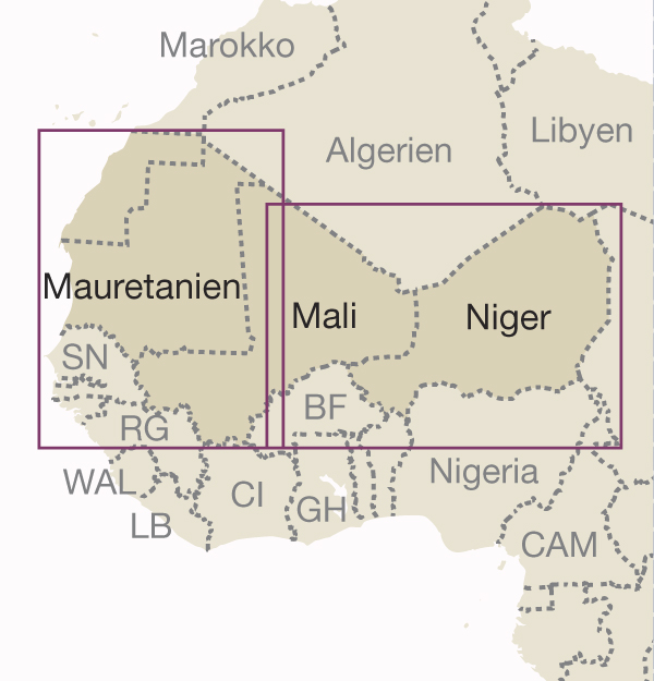 - Diese Karte umfasst die Länder Mali, Mauretanien und Niger.