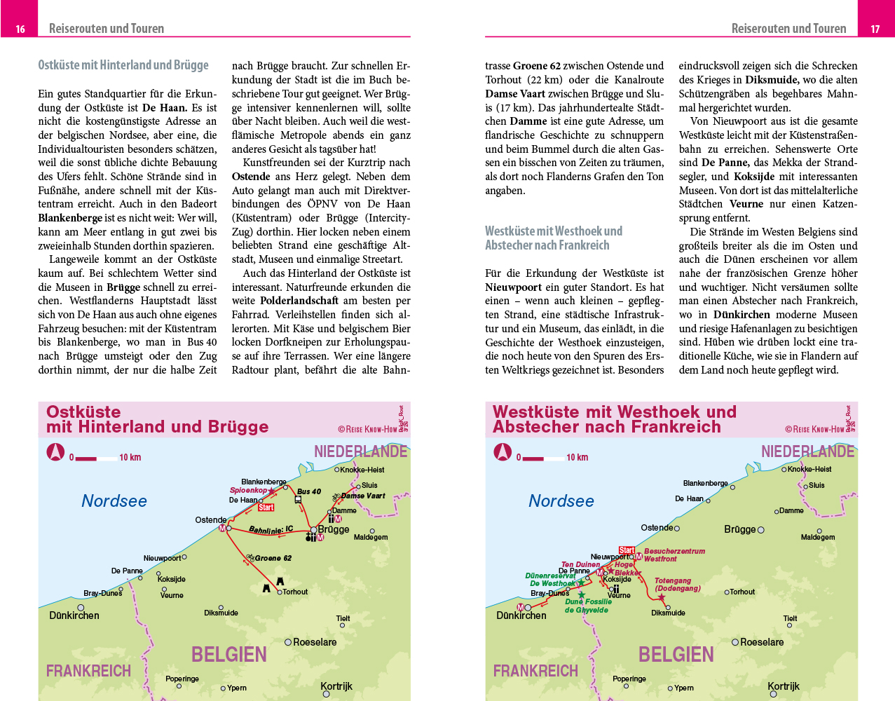 An der 67 Kilometer langen Nordseeküste reihen sich mondäne Seebäder, breite Sandstrände und Promenaden aneinander. Nur wenige Kilometer landeinwärts eröffnet sich eine andere Welt. Hier, im ländlichen Westflandern, prägen beschauliche Dörfer, ruhige Polderlandschaften und malerische Kanalwege das Bild. Neben den berühmten Kunst- und Kulturstädten wie Brügge und Ostende locken vor allem die stillen Naturreservate und Dünenlandschaften, die sich am besten zu Fuß oder mit dem Rad entdecken lassen.