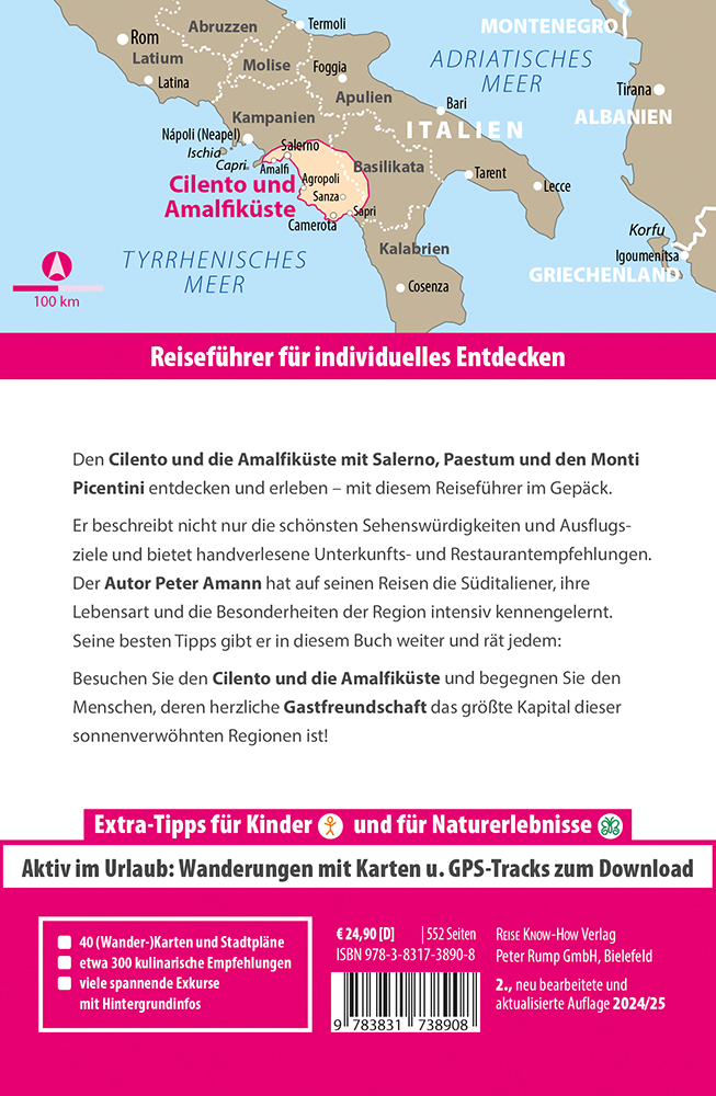 Dieser Reiseführer Cilento und Amalfiküste handelt vom Golf von Salerno, obwohl er im Titel nicht erwähnt wird. Vielen ist der Golf von Neapel bekannt, doch auch die sich südlich anschließende, weitaus größere Meeresbucht ist ein lohnendes Reiseziel. Drei unterschiedliche Küstenlandschaften öffnen sich zum Golf von Salerno. Kaum einer Vorstellung bedarf die weltberühmte Amalfiküste, raubt sie doch jedem den Atem: den Betrachtern vor Begeisterung und den Autofahrern vor Aufregung. Maurische Architektur prägt die Orte und auch der Zitronenanbau auf terrassierten Hängen ist Frucht eines intensiven Kulturaustauschs mit dem Orient. Ein gut unterhaltenes Netz alter Wirtschaftswege durchzieht das gebirgige Hinterland und zeigt sich heute als Wandernetz zwischen Himmel und Meer. Die UNESCO hat dieses harmonische Miteinander von Kultur und Natur zum Welterbe erklärt. Doch die Amalfitana besitzt noch viele weitgehend unbekannte Facetten, die es zu entdecken gilt.