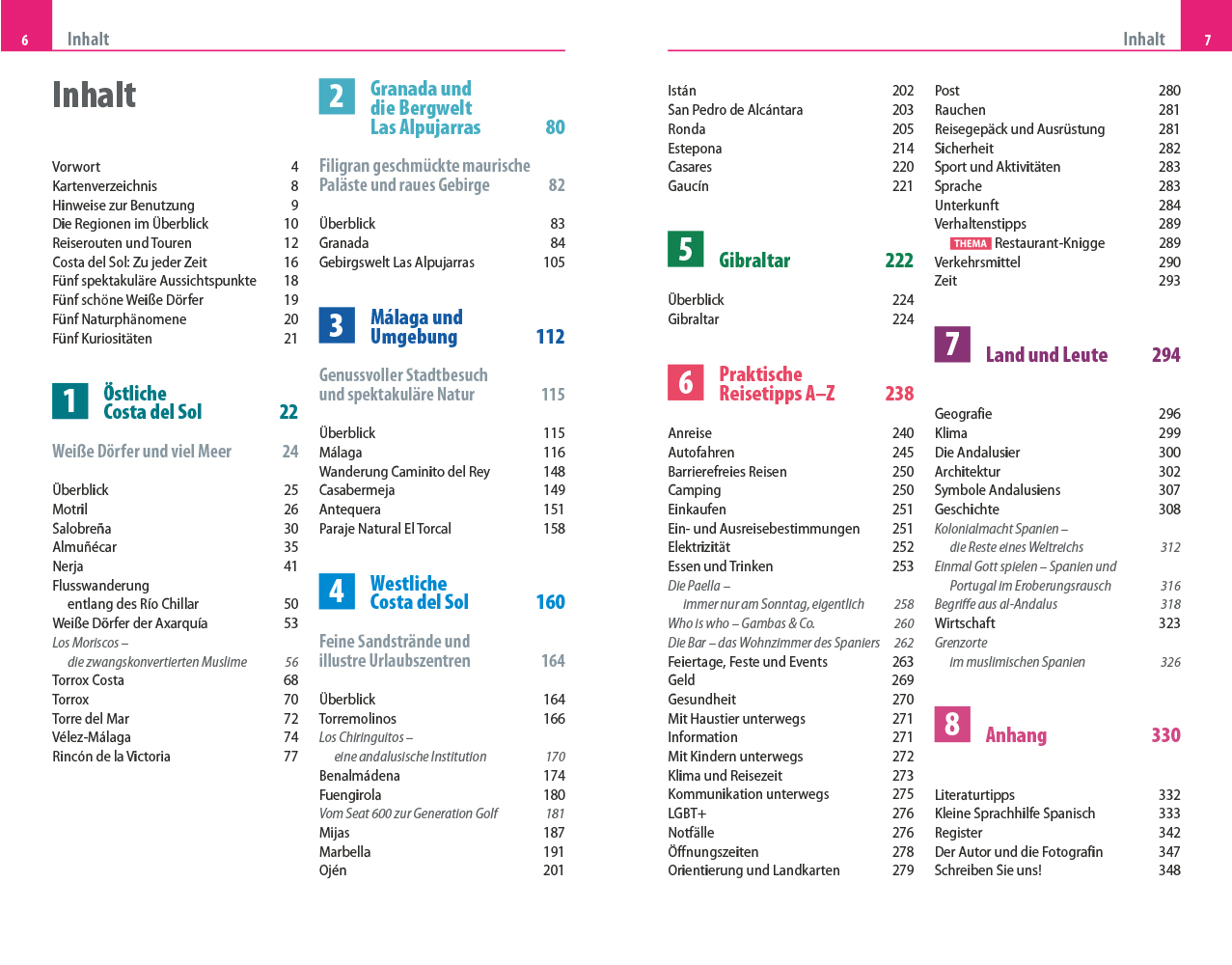 - Übersichtsseiten mit Beschreibungen aller Regionen: der Osten, Granada & die Bergwelt Las Alujarras, Málaga & und Umgebung, der Westen, Gibraltar