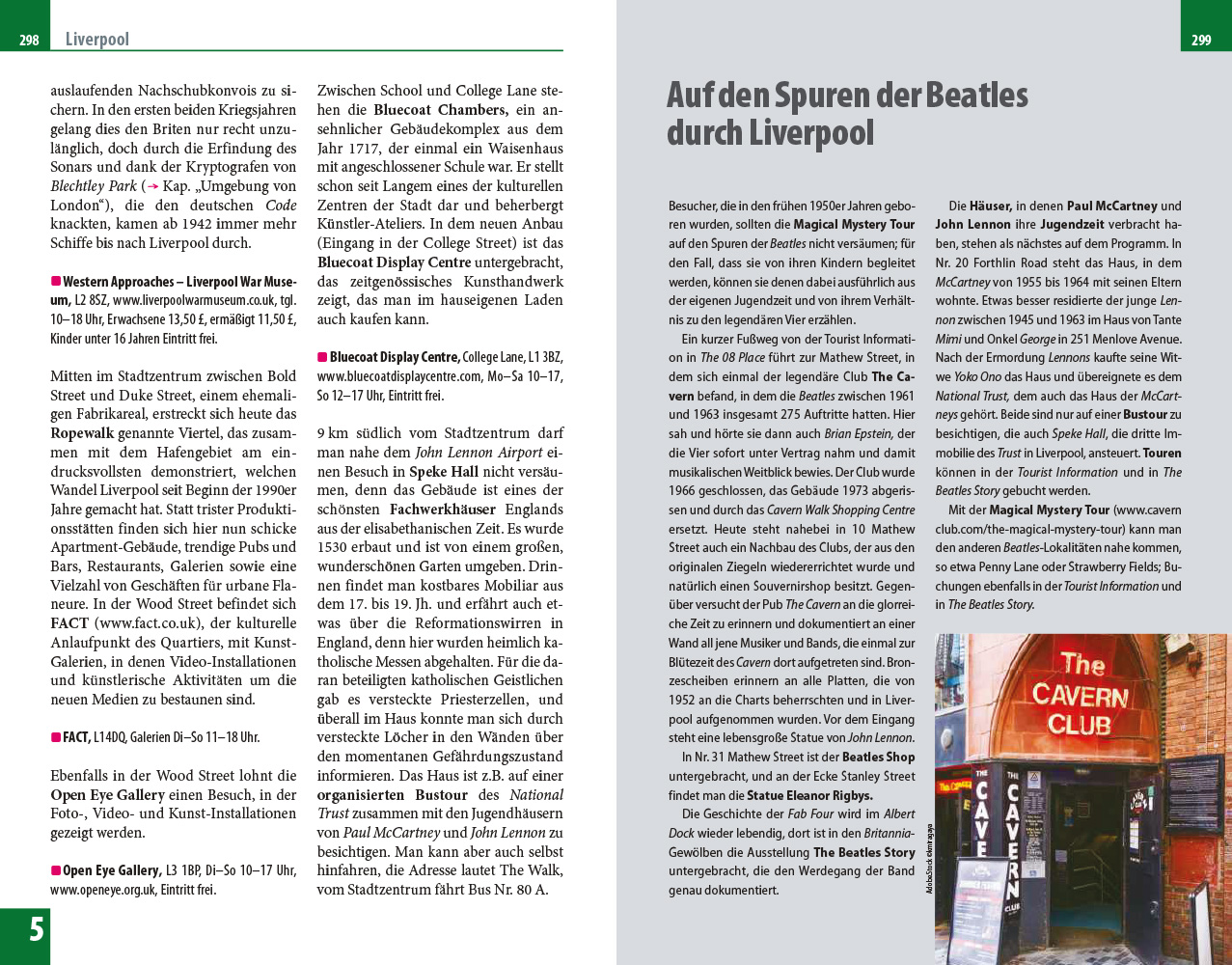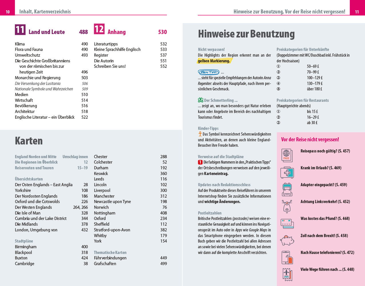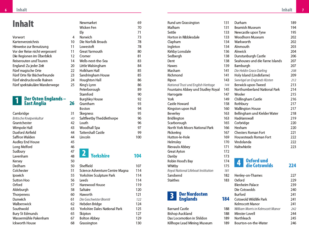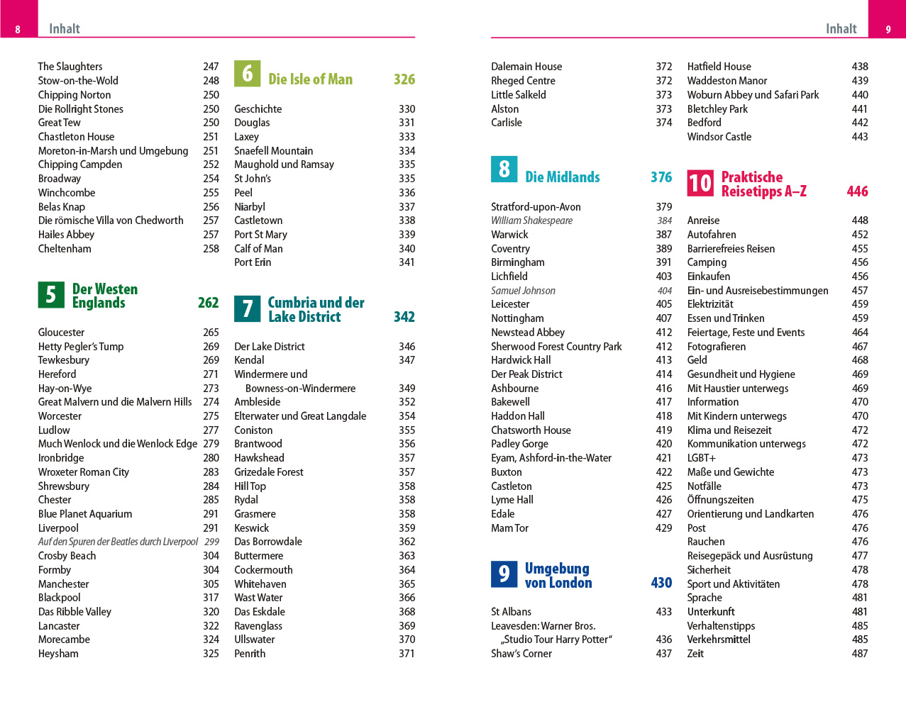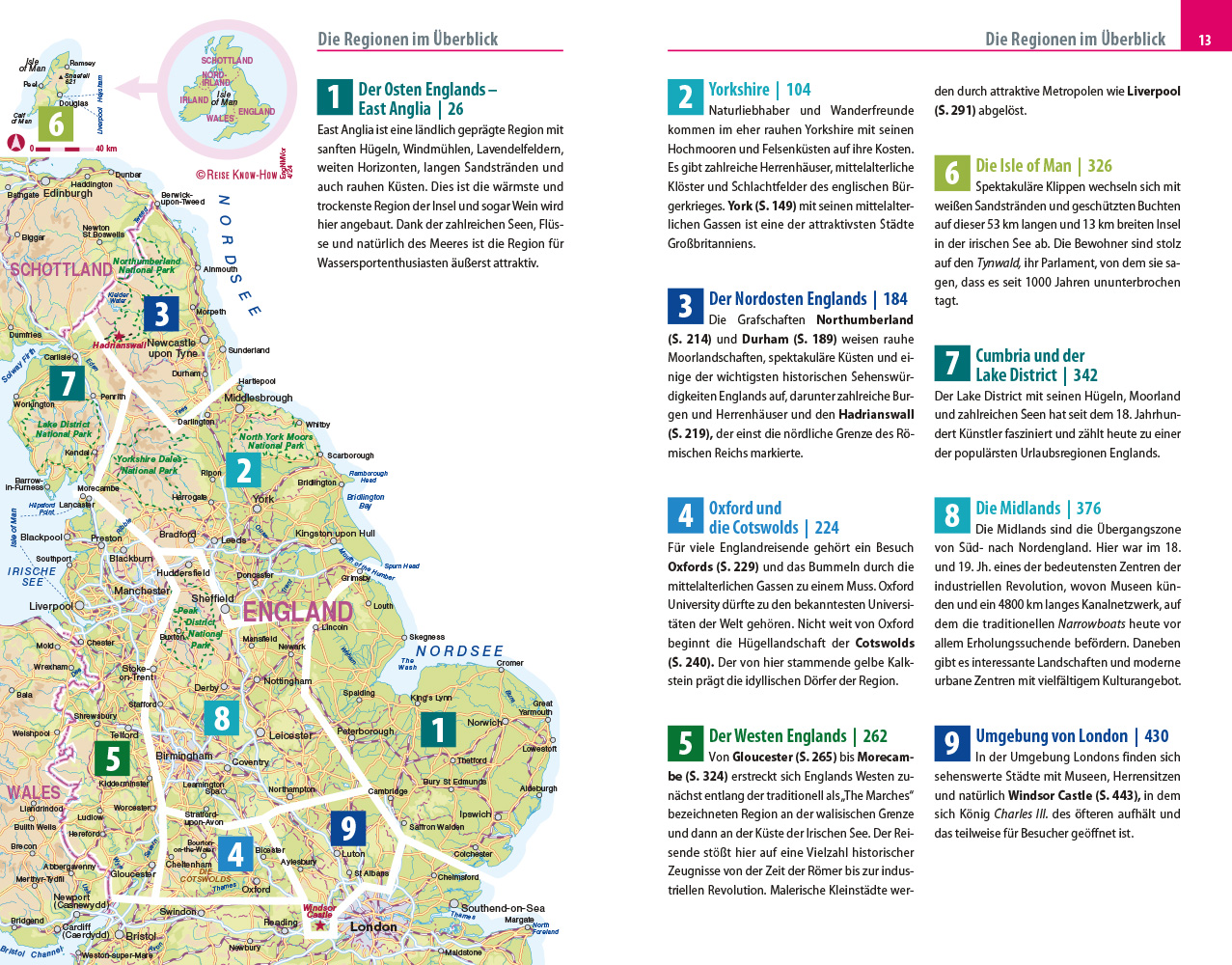 - Übersichtsseiten mit Beschreibungen aller Regionen: Von East Anglia, Yorkshire und dem Nordosten Englands über die Midlands, die Umgebung Londons, Oxford und die Cotswolds bis nach Westen mit Cumbria und dem Lake District und zur Isle of Man
