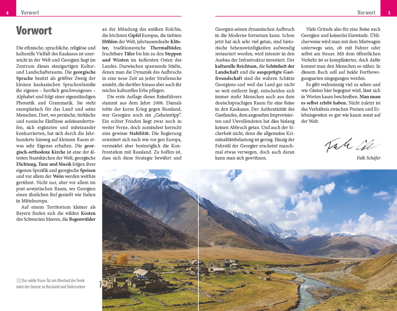 Autor Falk Schäfer zeigt in seinem Reiseführer alle sehenswerten Orte des Landes zwischen einsamen Waldlandschaften und den palmengesäumten Steinstränden des Schwarzen Meeres auf. Doch die sehenswerten Orte sind nicht alles: „Der kulturelle Reichtum, die Schönheit der Landschaft und die ausgeprägte Gastfreundschaft sind die wahren Schätze Georgiens“, sagt Falk Schäfer. „Es gibt wahnsinnig viel zu sehen und wie Gästen hier begegnet wird, lässt sich in Worten kaum beschreiben. Man muss es selbst erlebt haben.“