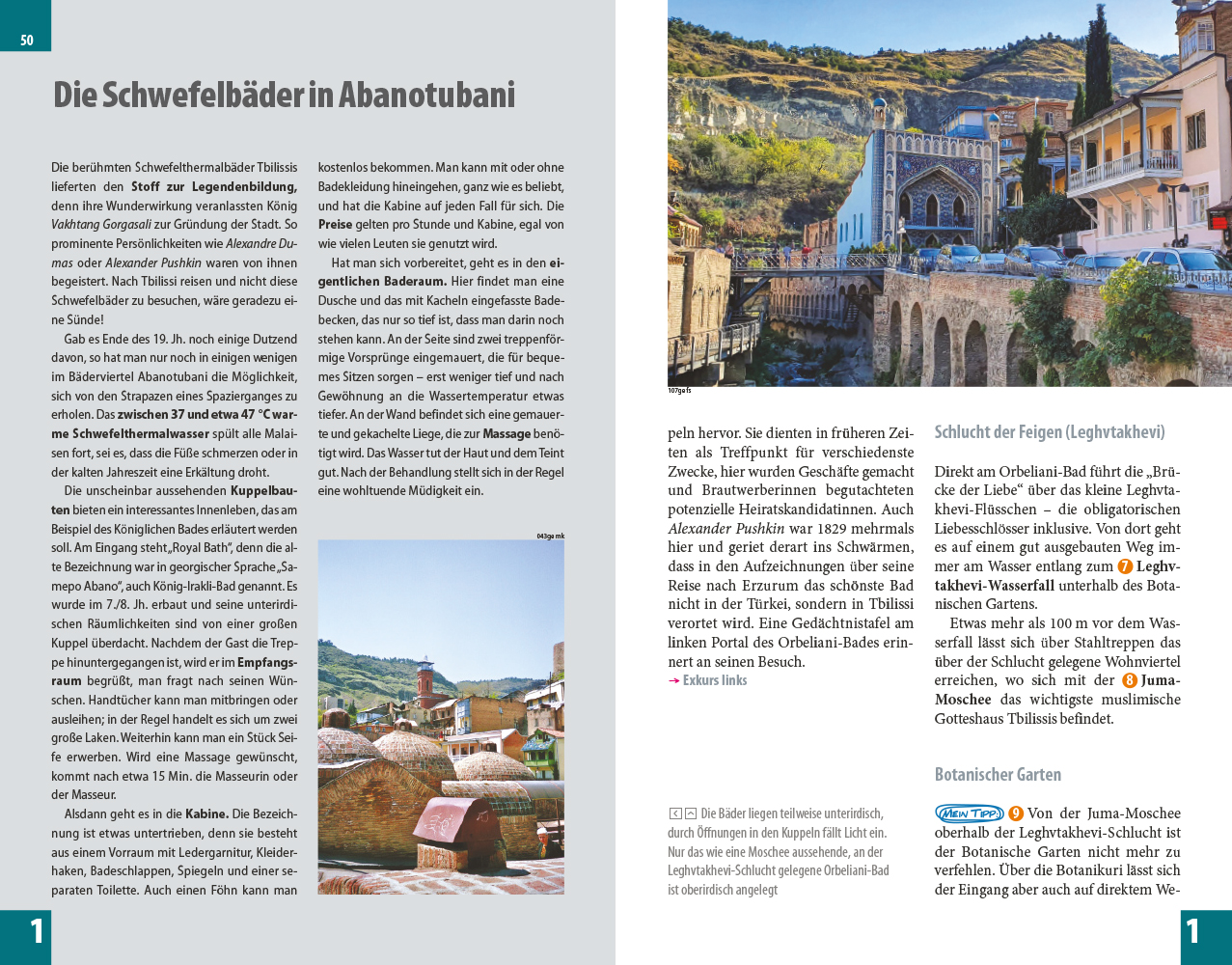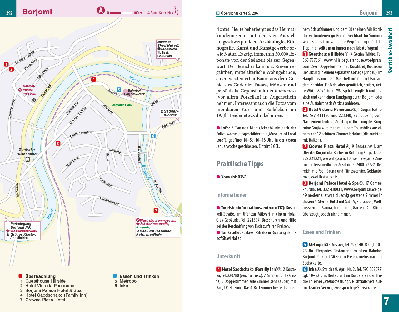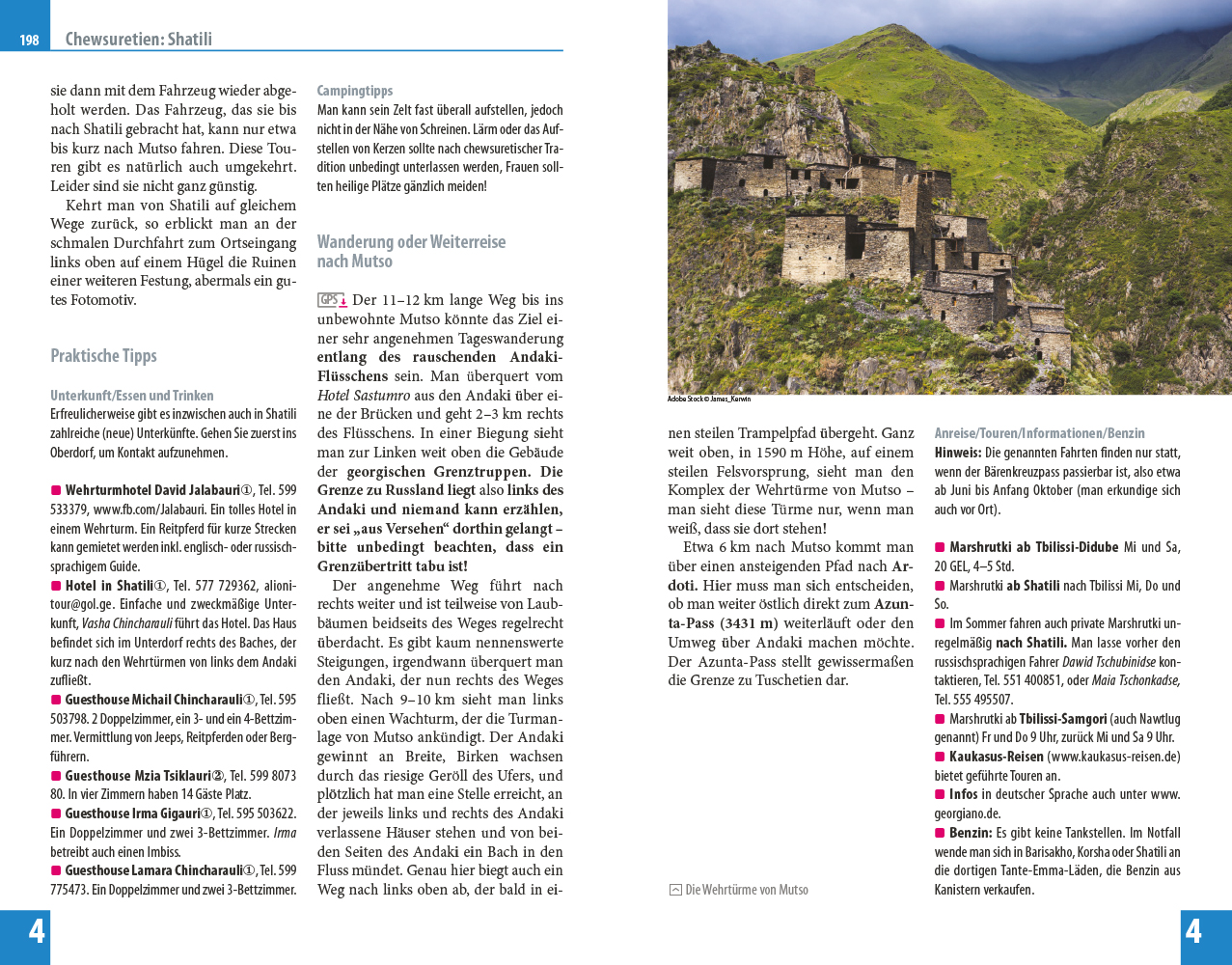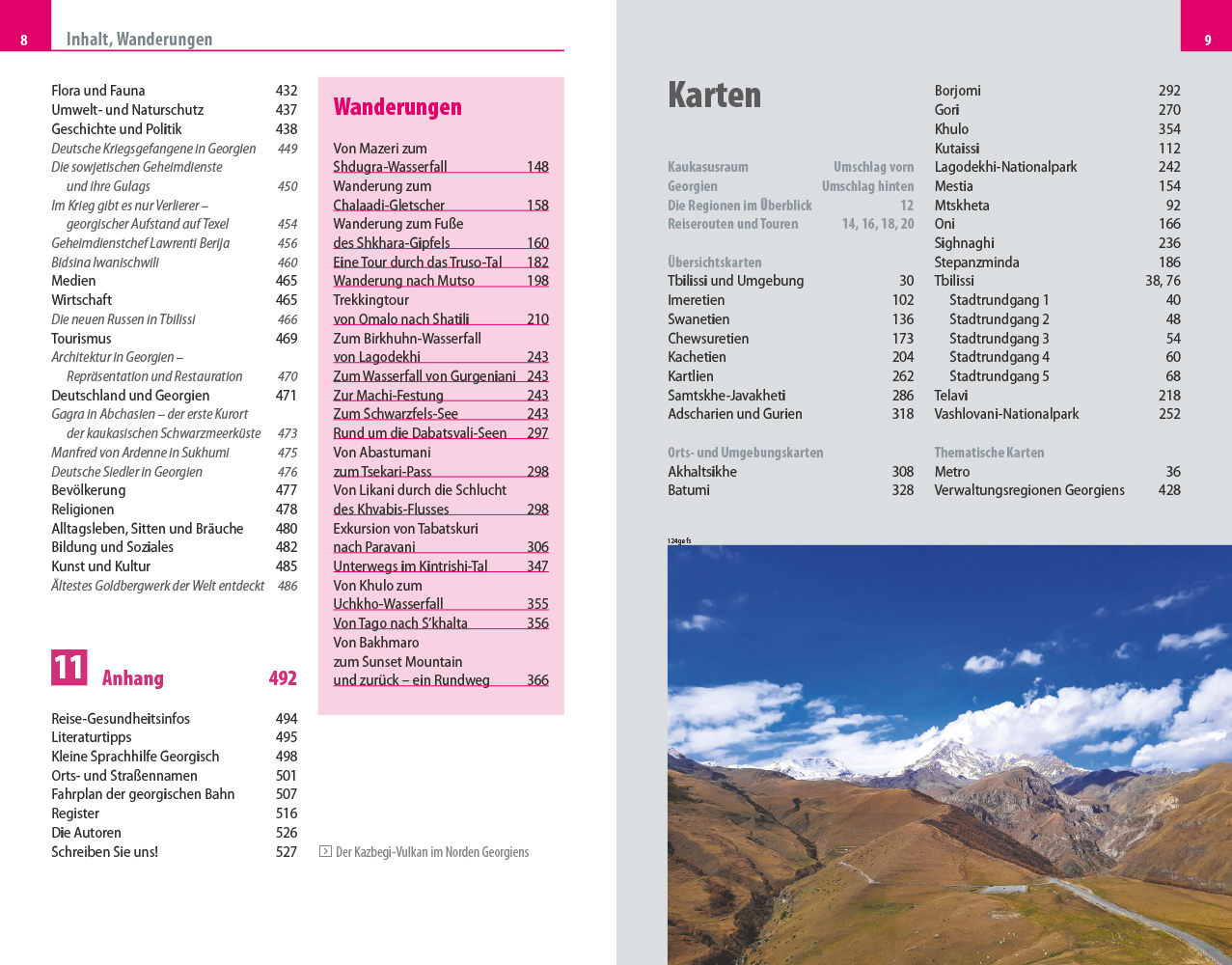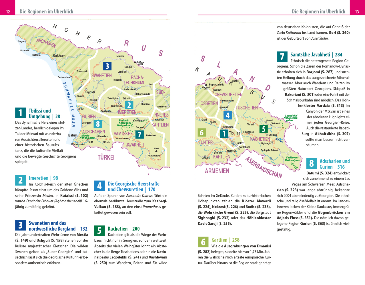 Im Vorspann finden sich Übersichtsseiten mit Beschreibungen aller Regionen, eine Jahresübersicht zu Festen und Veranstaltungen, Routenvorschläge und persönliche Top-Tipps des Autors. Jedes Kapitel beginnt mit einer Doppelseite, auf der die Inhalte mit einer Karte der Region, Highlights und Seitenverweisen vorgestellt werden. Viele spezielle Infos, beispielsweise zur Anreise und zu den vielfältigen Möglichkeiten an Aktivitäten, sind hilfreiche Planungshelfer. Selbstfahrer finden ebenso wie Reisende, die mit öffentlichen Verkehrsmitteln unterwegs sind, alle notwendigen Informationen. Tipps zu naturnahem und nachhaltigem Reisen sowie zum Reisen mit Kindern helfen bei der Auswahl der passenden Adressen. Eine kleine Sprachhilfe Georgisch erleichtert die Konversation vor Ort.