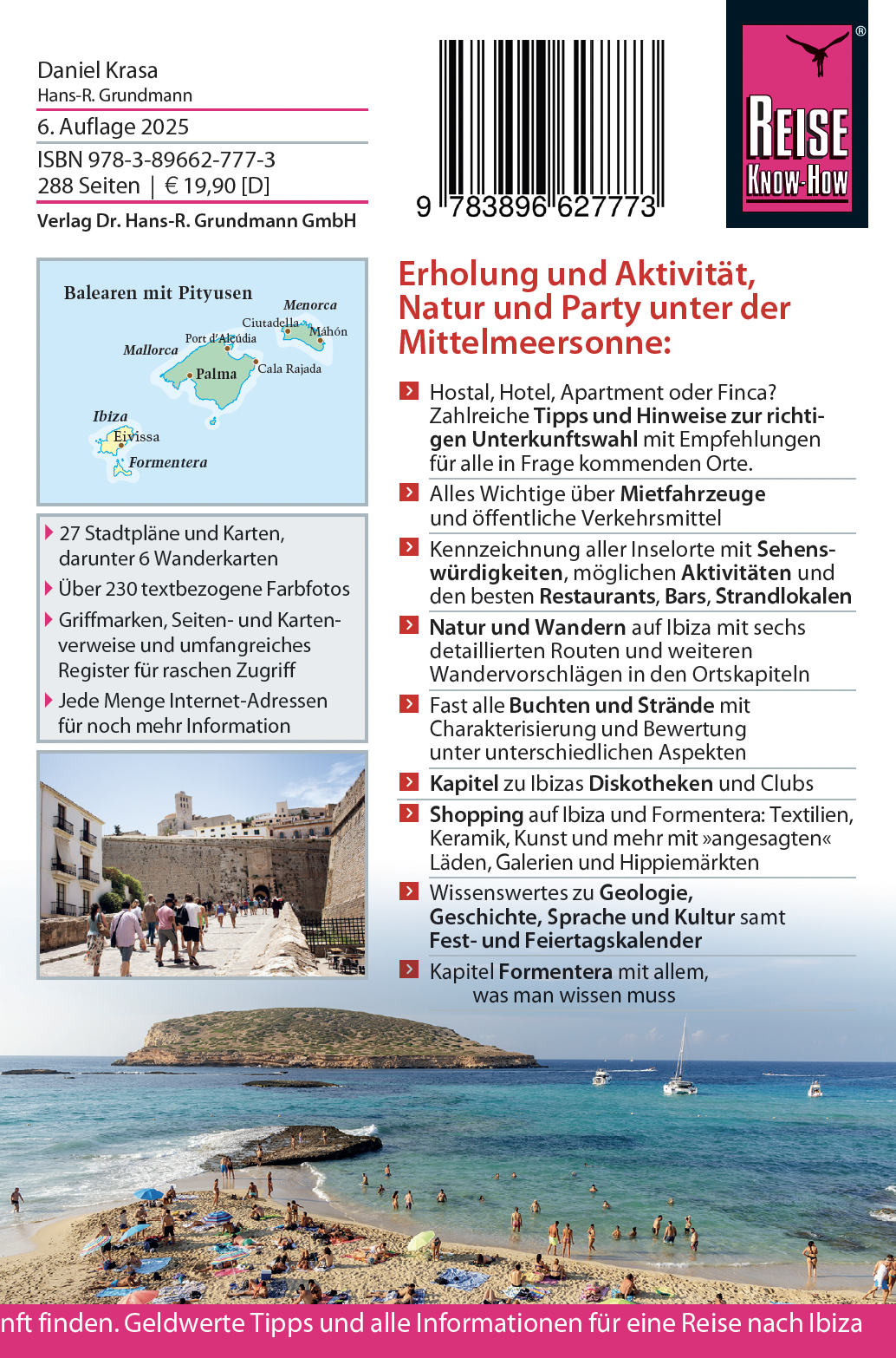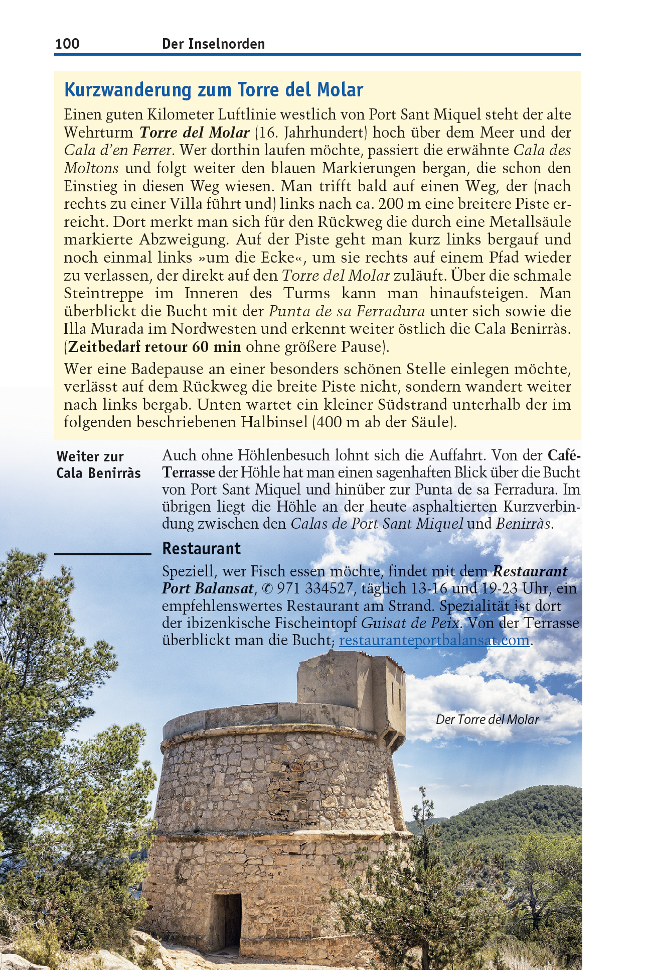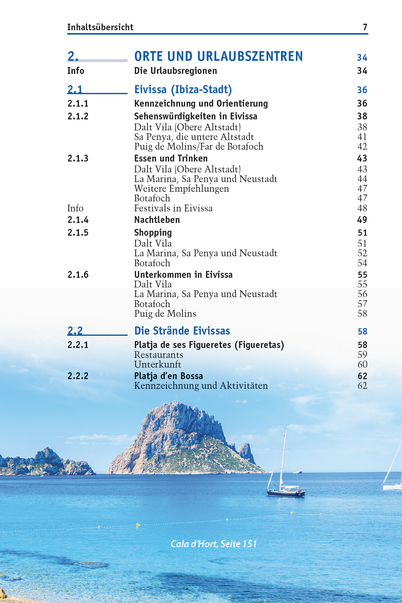 - Beschreibungen aller Städte, Regionen und Strände Ibizas: Eivissa (Ibiza-Stadt), Santa Eulària des Riu und der Osten, der Inselnorden mit Port Sant Miquel und Portinatx, der Nordwesten mit Sant Antoni, der Südwesten mit Sant Josep de Sa Talaia (San José) und der äußerste Süden