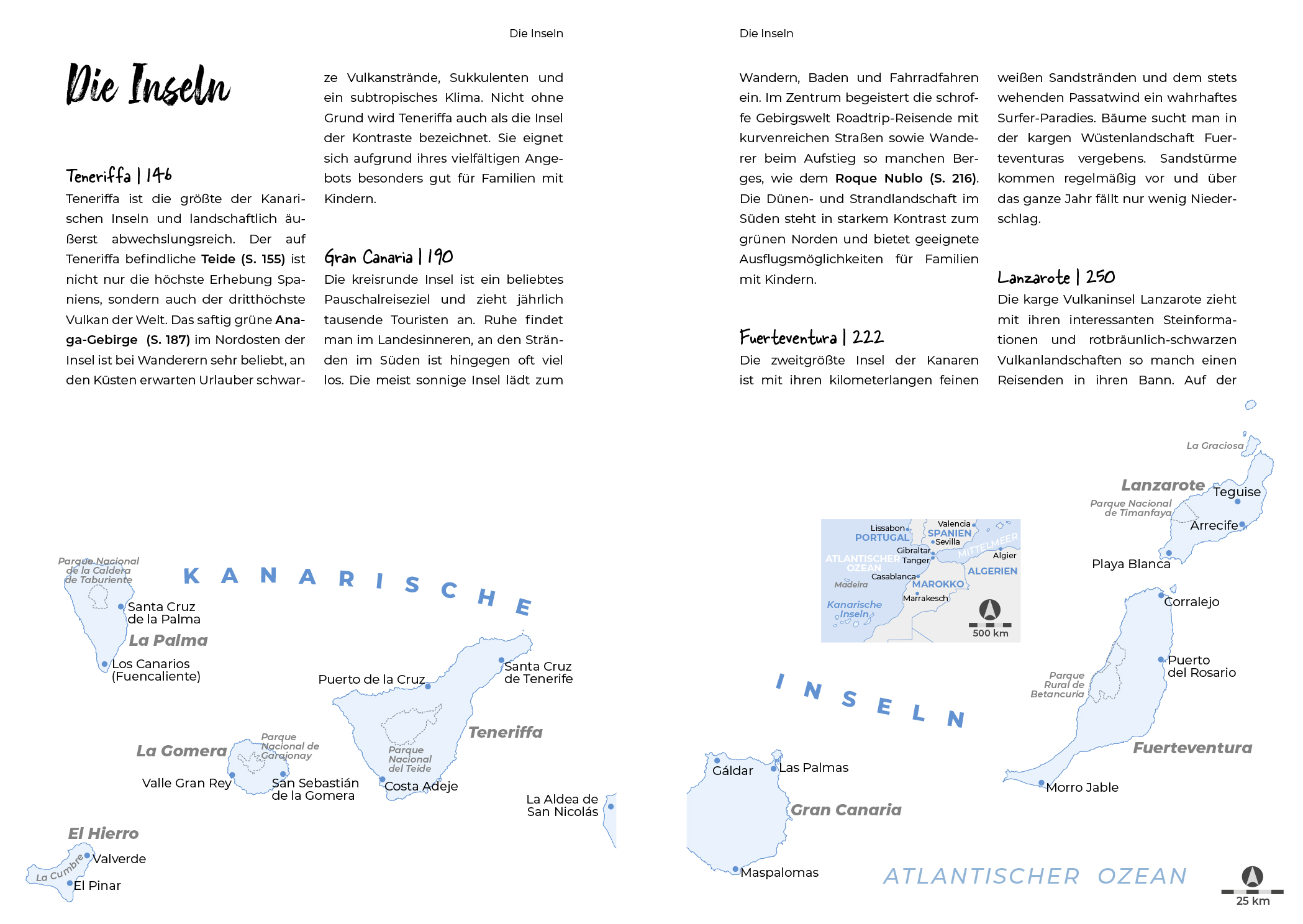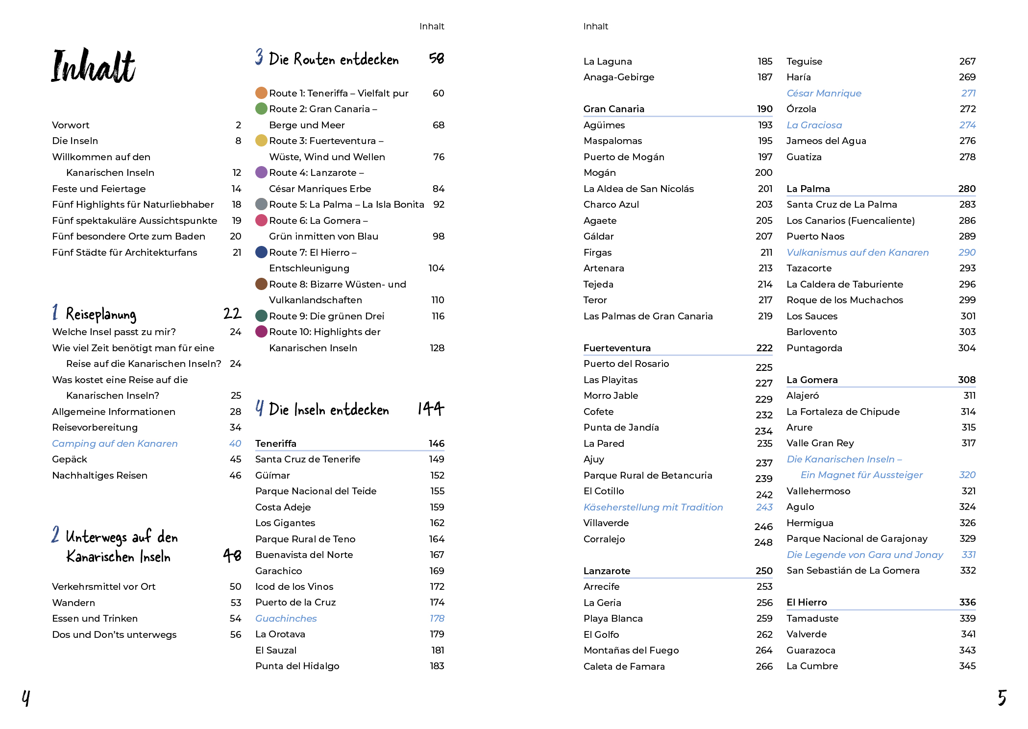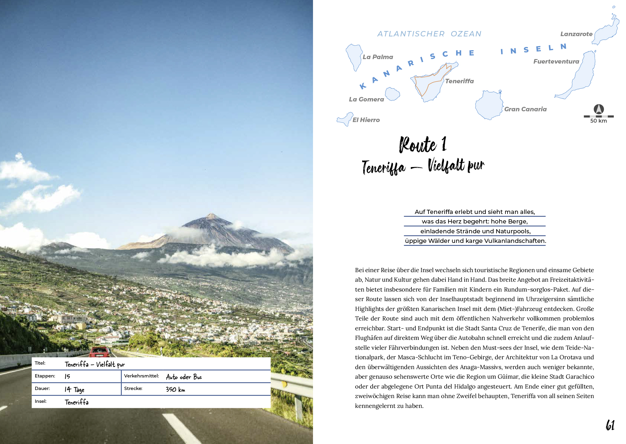 Nur wenige Reiseziele bieten auf kleinem Raum eine solche Vielfalt wie die Kanaren. Die Inselgruppe vor der Küste Afrikas bietet einen besonderen Mix aus Wüstenlandschaften, Vulkanen, subtropischen Wäldern und traumhaften Küstenabschnitten, dazu einen scheinbar nie endenden Frühling. Riesige Wegenetze an Wanderrouten, ein gut ausgebautes Nahverkehrsnetz und spektakuläre Panoramastraßen machen die Inseln auf vielfältige Weise erlebbar. Dieser Reiseroutenführer ermöglicht es, Reiseziele entlang und abseits der Touristenpfade intensiv und individuell zu erkunden.