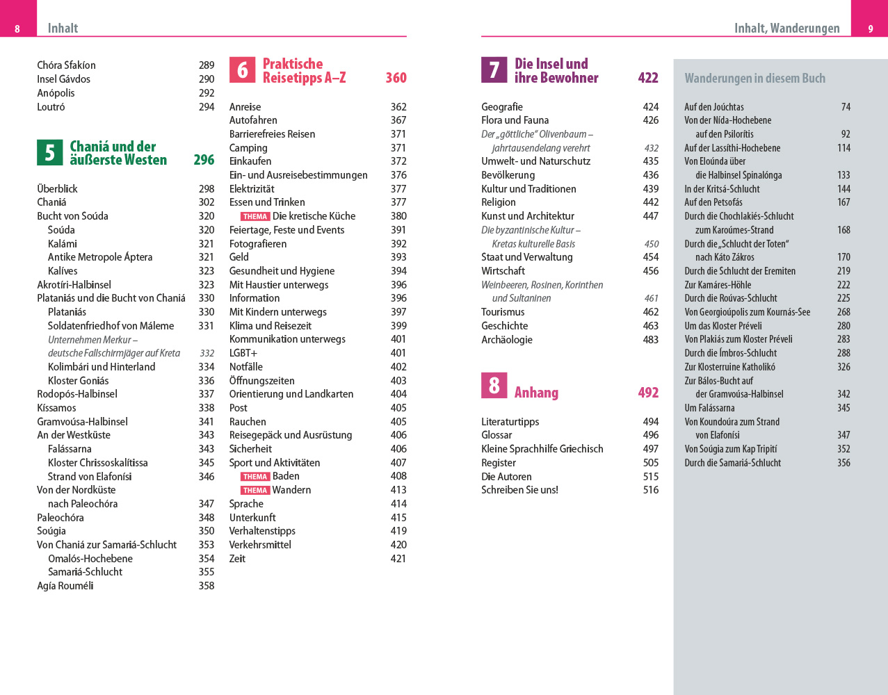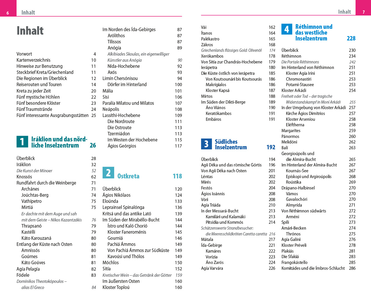 - Übersichtsseiten mit Beschreibungen aller Regionen: Iráklion und das nördliche Inselzentrum, Ostkreta, südliches Inselzentrum, Réthimnon und das westliche Inselzentrum, Chaniá und der äußerste Westen