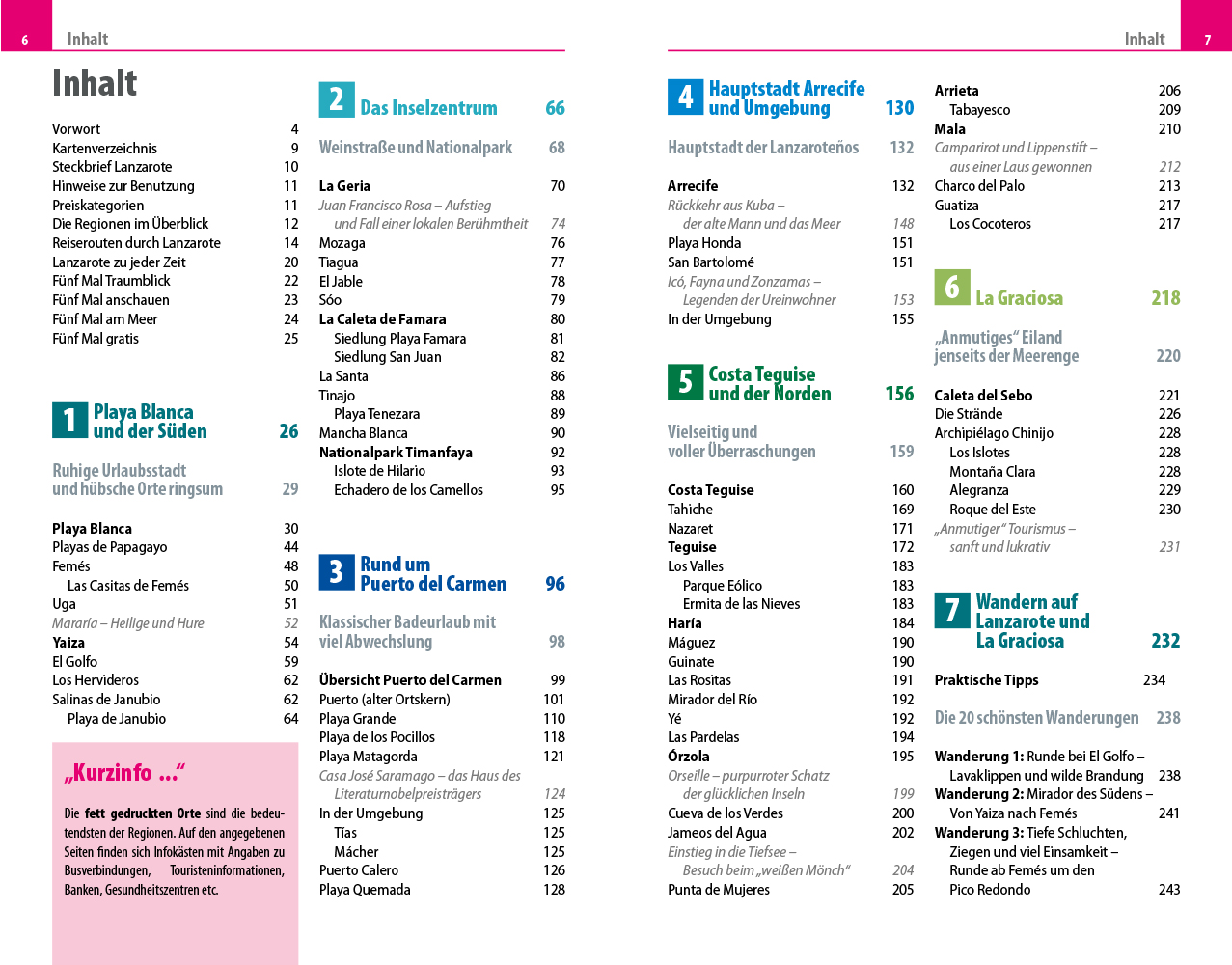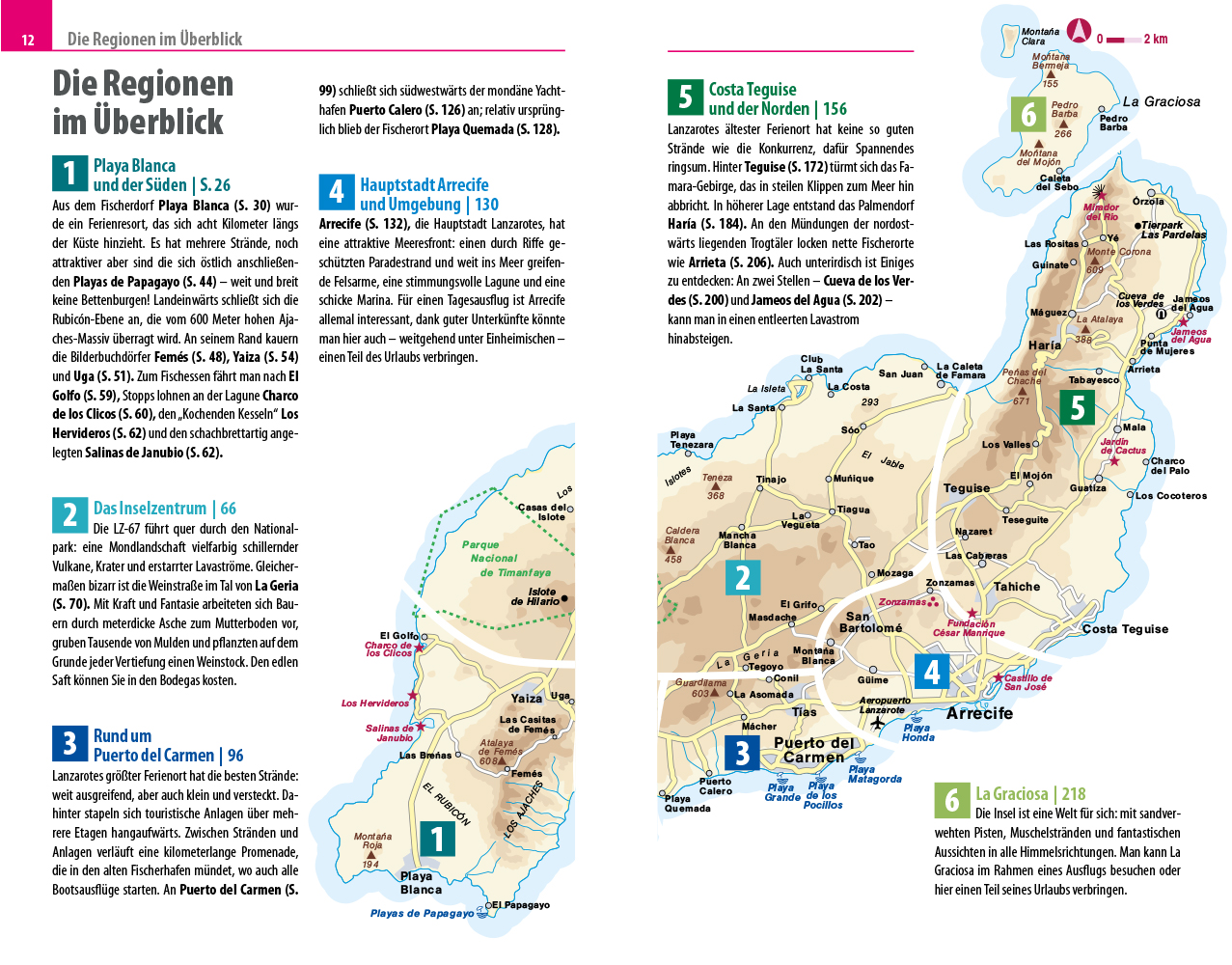 - Übersichtsseiten mit den bedeutendsten Regionen der Insel: Playa Blanca und der Süden, das Inselzentrum, Puerto del Carmen, Arrecife und Umgebung, Costa Teguise und der Norden sowie La Graciosa