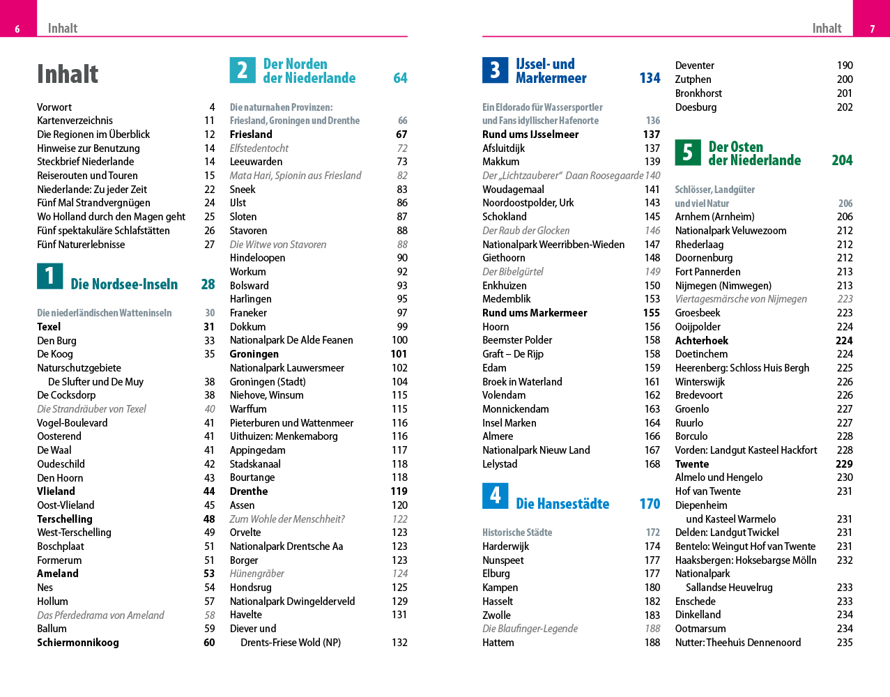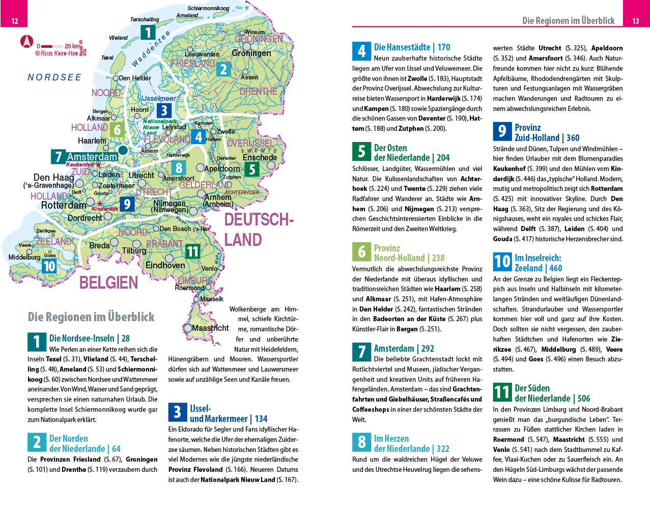 - Übersichtsseiten mit Beschreibungen aller Regionen: Die Nordseeinseln: Texel, Vlieland, Terschelling, Ameland & Schiermonnikoog, der Norden der Niederlande: Friesland, Groningen & Drenthe, Ijssel- und Markermeer, die Hansestäste, der Osten der Niederlande mit Achterhoek & Twente, die Provinz Noord-Holland, Amsterdam, im Herzen der Niederlande, die Provinz Zuid-Holland, Zeeland, der Süden der Niederlande