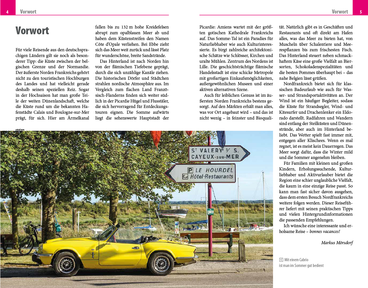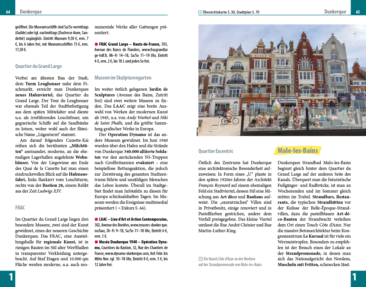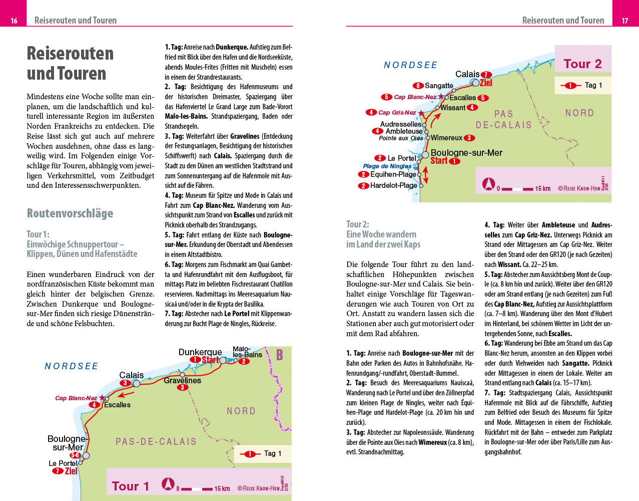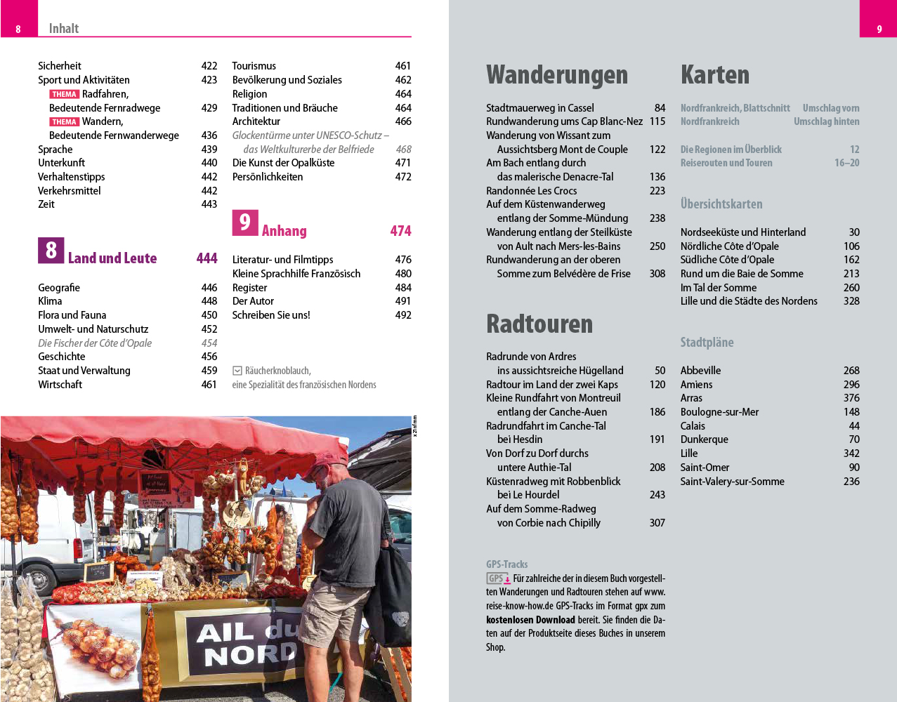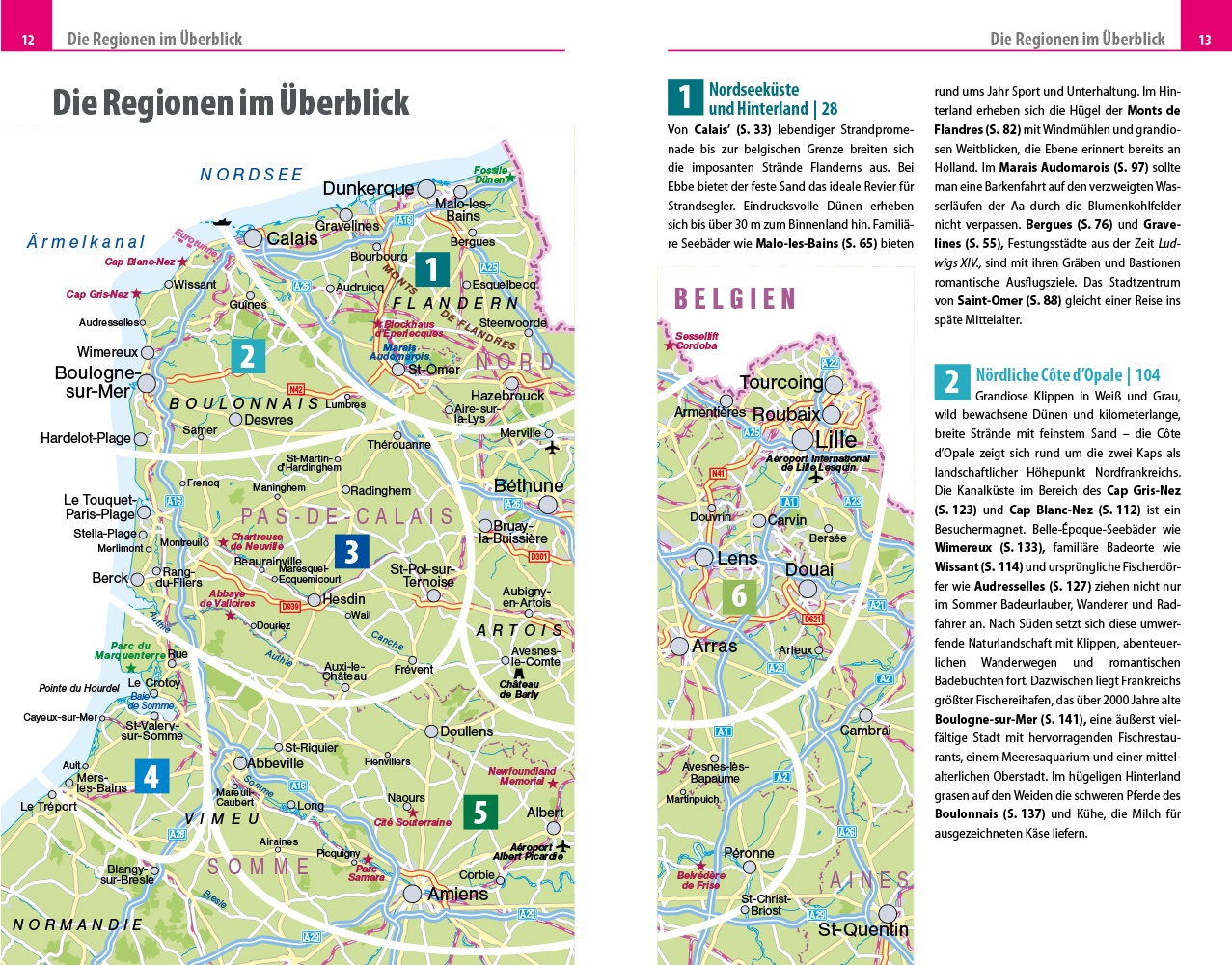 - Übersichtsseiten mit Beschreibungen aller Regionen: Nordseeküste und Hinterland, Nördliche und Südliche Côte d’Opale, rund um die Baie de Somme, das Tal der Somme sowie Lille und die Städte des Nordens