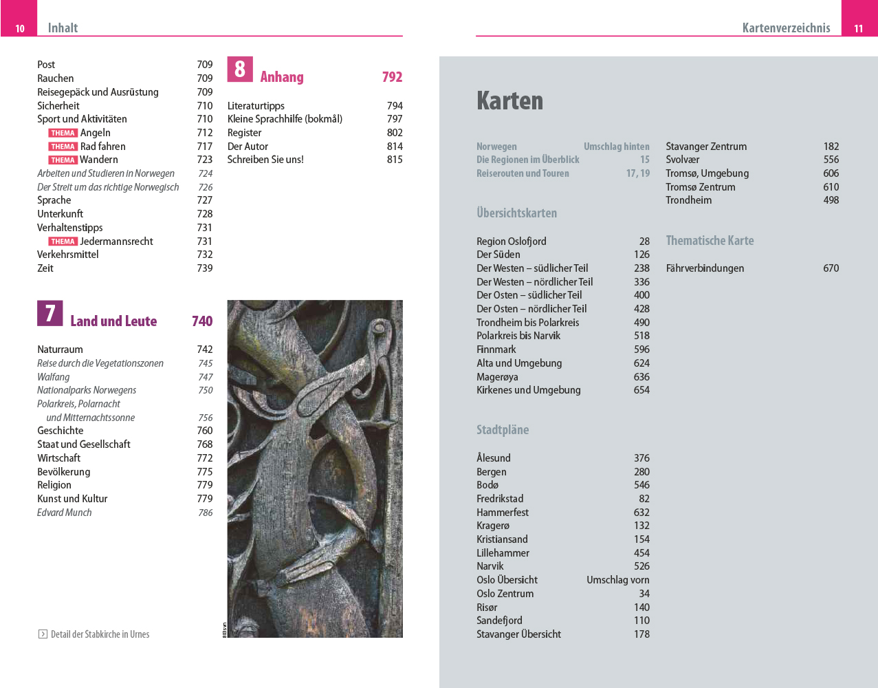 - Übersichtsseiten mit Beschreibungen aller Regionen: Oslo und Umgebung – östlich und westlich des Oslofjords, der Süden – immer an der Küste entlang, der Westen – Hardangerfjord, die Küste zwischen Stavanger und Bergen, Sognefjordregion, Geirangerfjord und Trondheim, der Osten und Mittel- und Nordnorwegen mit Lofoten, Vesterålen, Troms und Finnmark