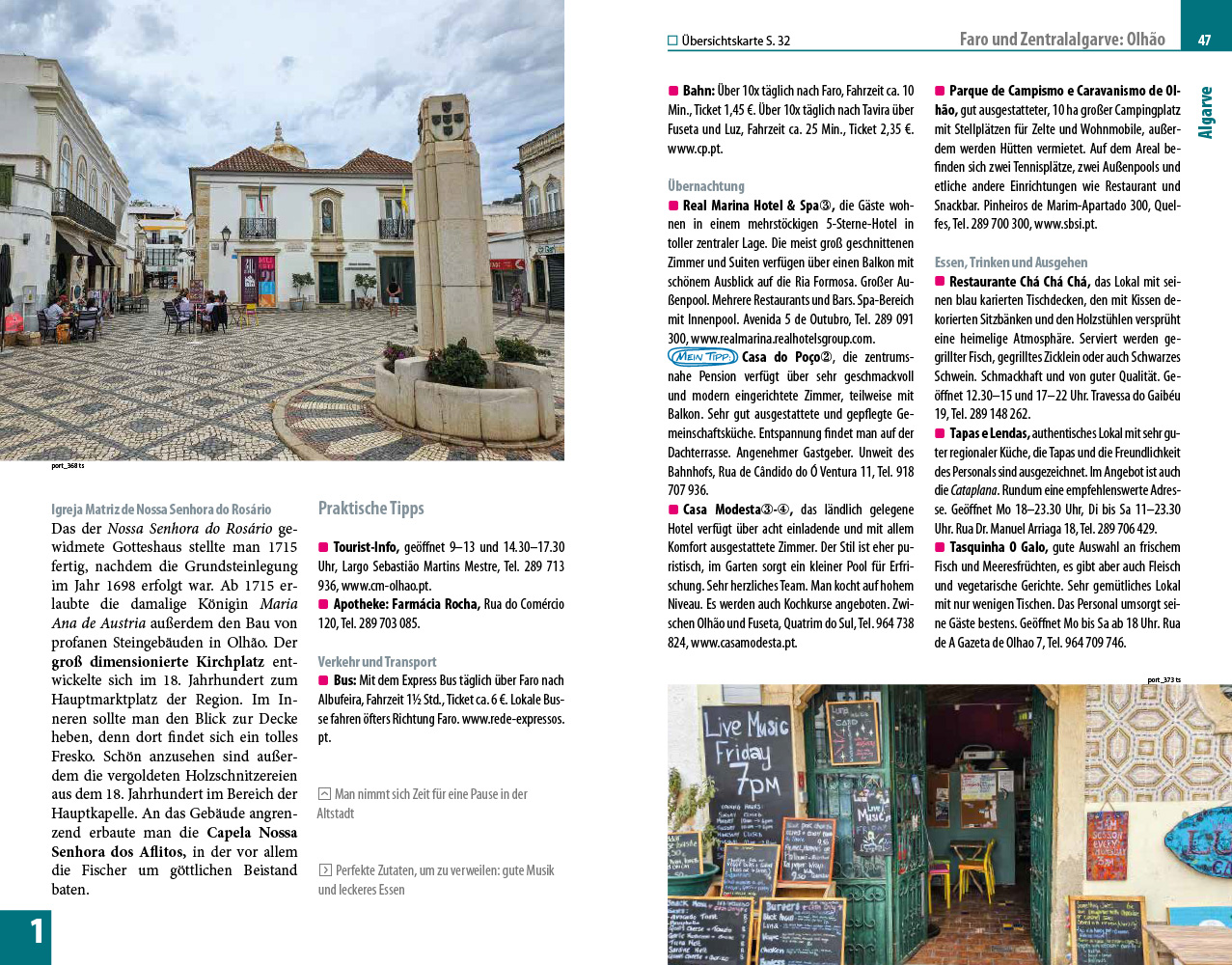 - Übersichtsseiten mit Beschreibungen aller Regionen: Algarve, Alentejo, Lissabon, Zentrales Portugal, Porto und der Norden