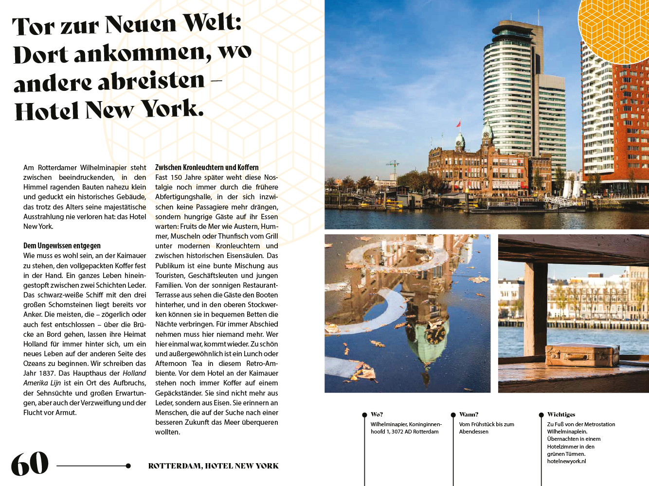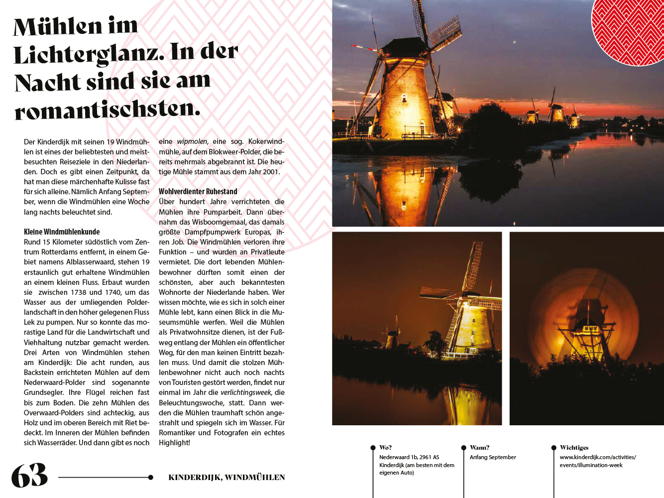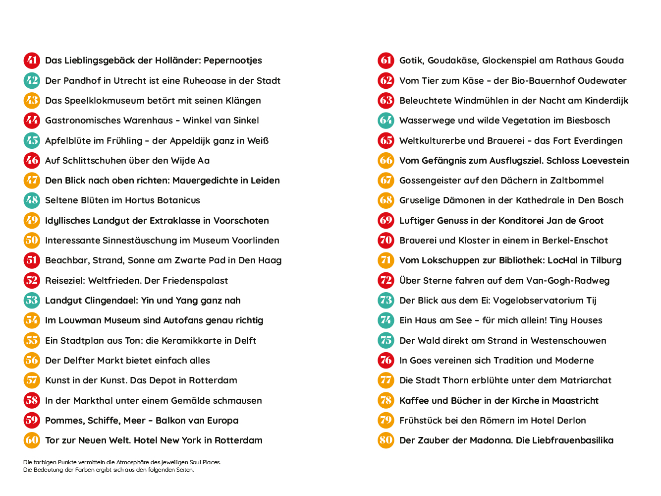 Die malerischen Backsteingassen des weißen Städtchens Thorn, die Markthalle von Rotterdam mit ihrem gigantischen Deckengemälde oder der zugefrorene Wijde Aa in Südholland, der zum Schlittschuhlaufen einlädt: All dies sind niederländische Soul Places. Orte, die den Menschen etwas bedeuten und von der Geschichte des Landes erzählen, die das Zeug haben, zu den schönsten Reiseerinnerungen und zu neuen Lieblings- und Sehnsuchtsorten zu werden.