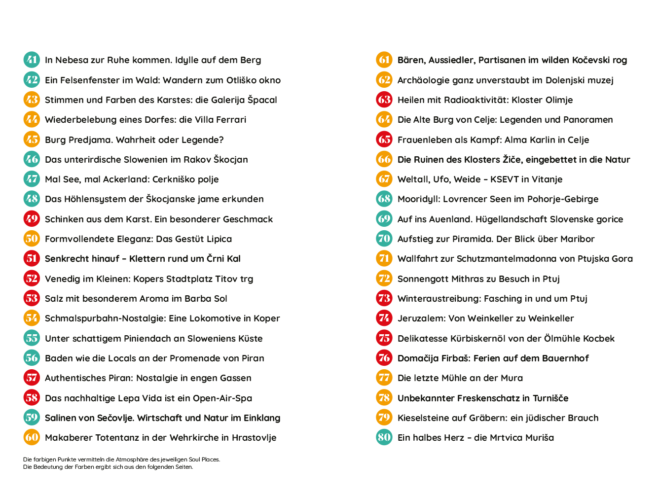 80 dieser Soul Places haben Daniela Schetar und Friedrich Köthe in ihrem Band Soul Places Slowenien versammelt. Zwischen den Schneegipfeln der Julier und den tiefen Wäldern entlang der kroatischen Grenze führen sie zu klingenden Wunschglocken, besonderer Street-Art und geheimnisvollen Höhlenlabyrinthen, zu majestätischen Landschaftstableaus und in stille Altstadtgassen, an Orte, die unterschiedlicher kaum sein könnten und dennoch auf ähnliche Weise das Innerste berühren.