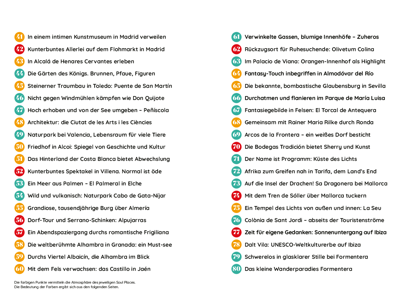 80 Soul Places hat Autor Andreas Drouve zwischen der rauen Natur des Kaps Fisterra und dem Großstadtdschungel von Madrid aufgespürt. Er führt zu einsamen Landhotels, weitläufigen Palmenhainen und auf Wanderungen mit atemberaubendem Ausblick, bietet Anknüpfungspunkt und Gelegenheit, mit der Natur Spaniens, den Menschen und ihren Geschichten in Berührung zu kommen.