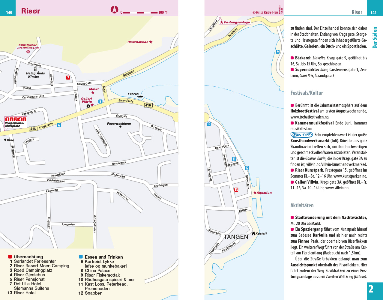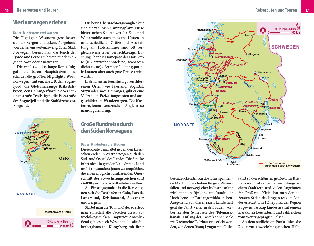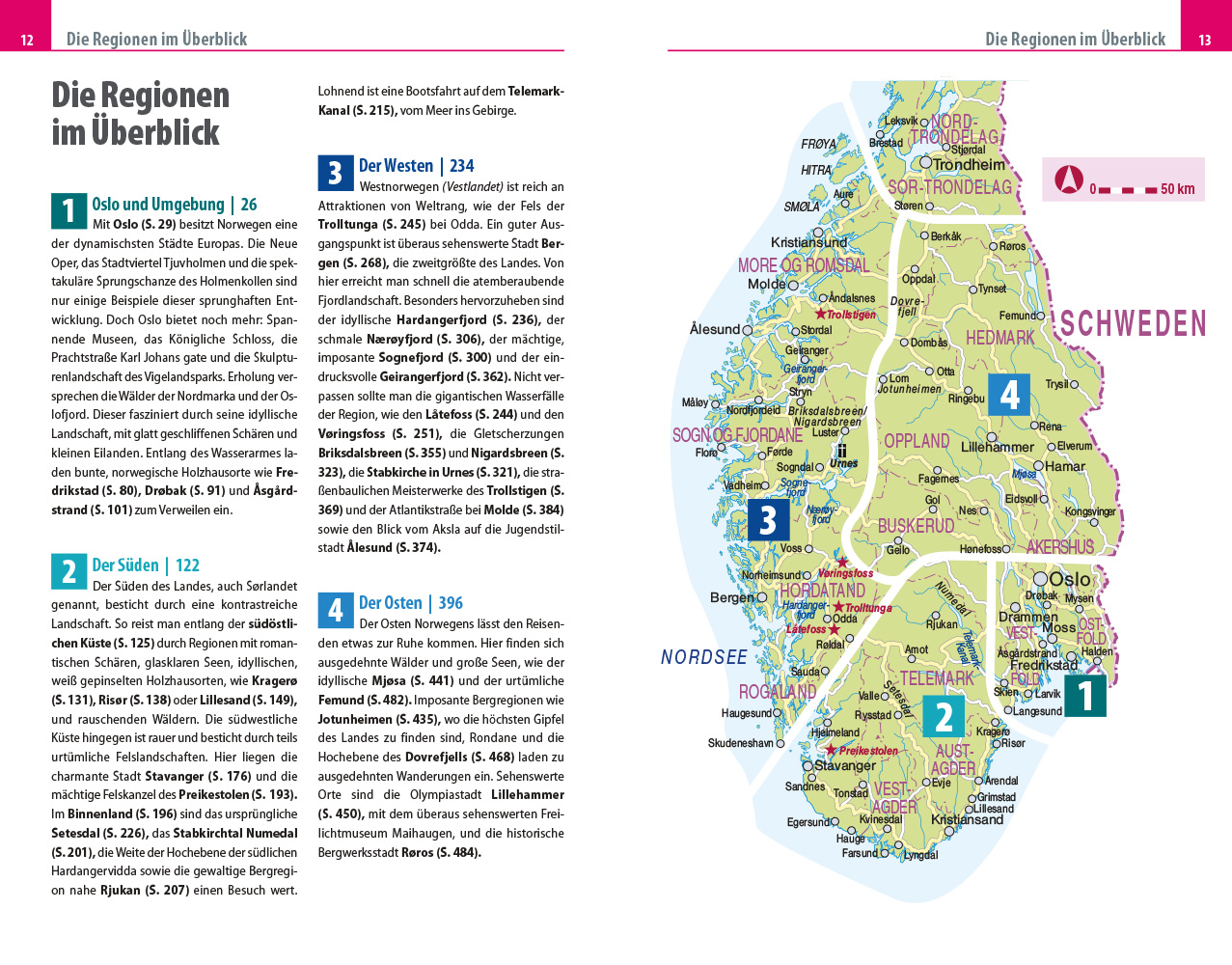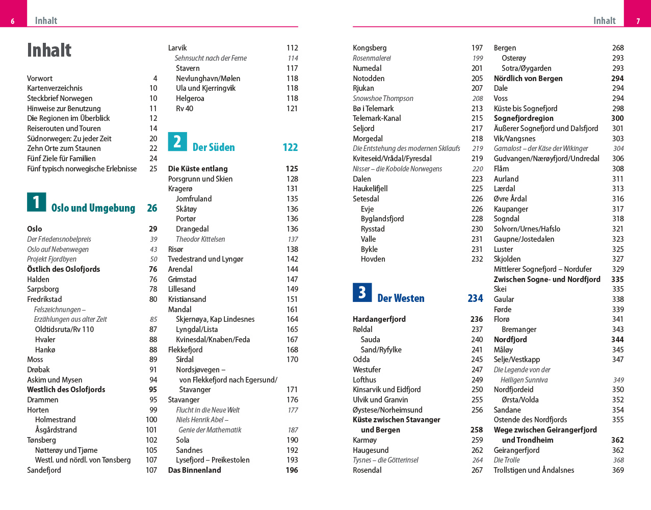 - Übersichtsseiten mit Beschreibungen aller Regionen: Oslo und Umgebung, der Süden von der Küste durchs Binnenland, der Westen von Hardeangerfjord bis Trondheim, der Osten von Gudbrandsdal bis Røros