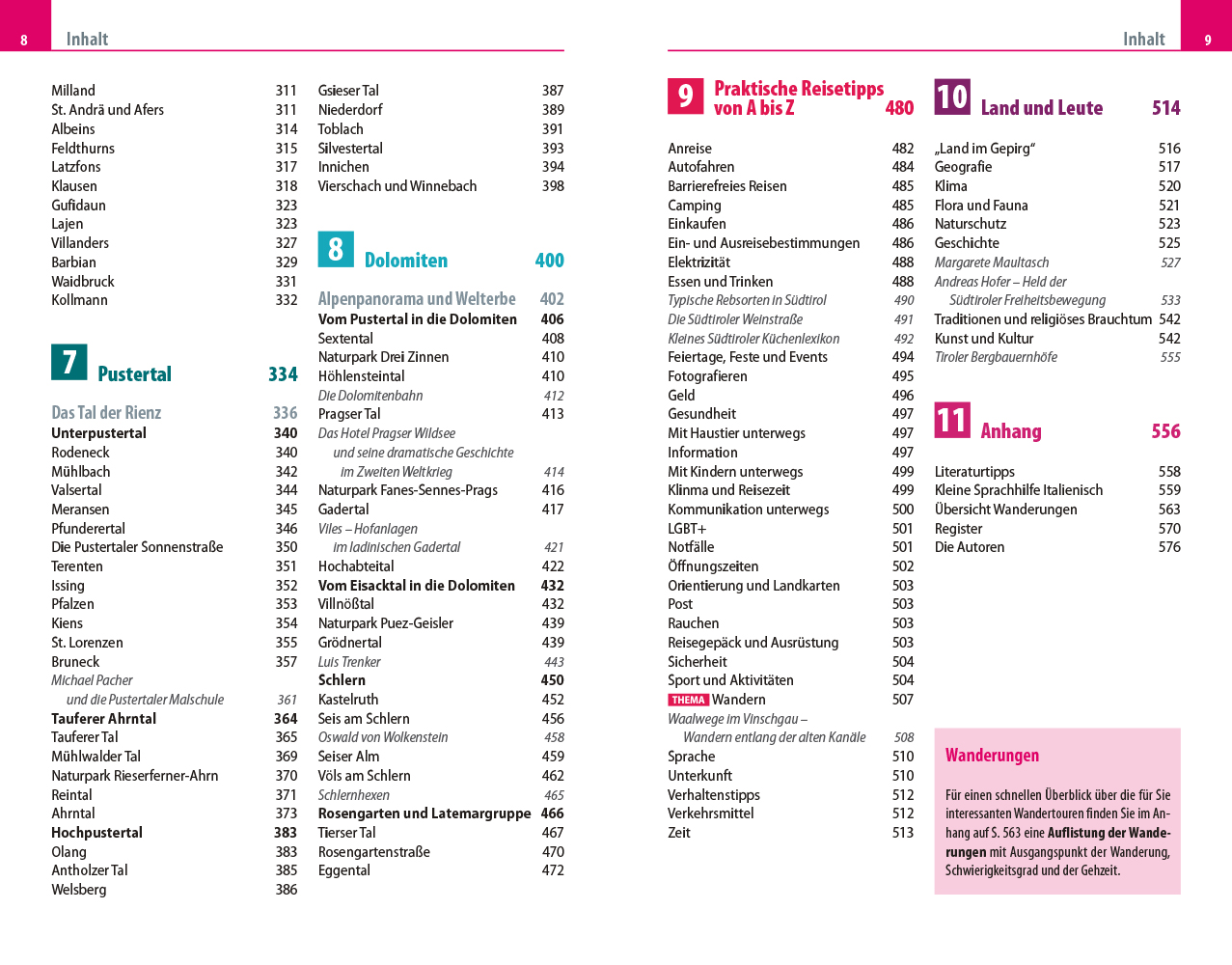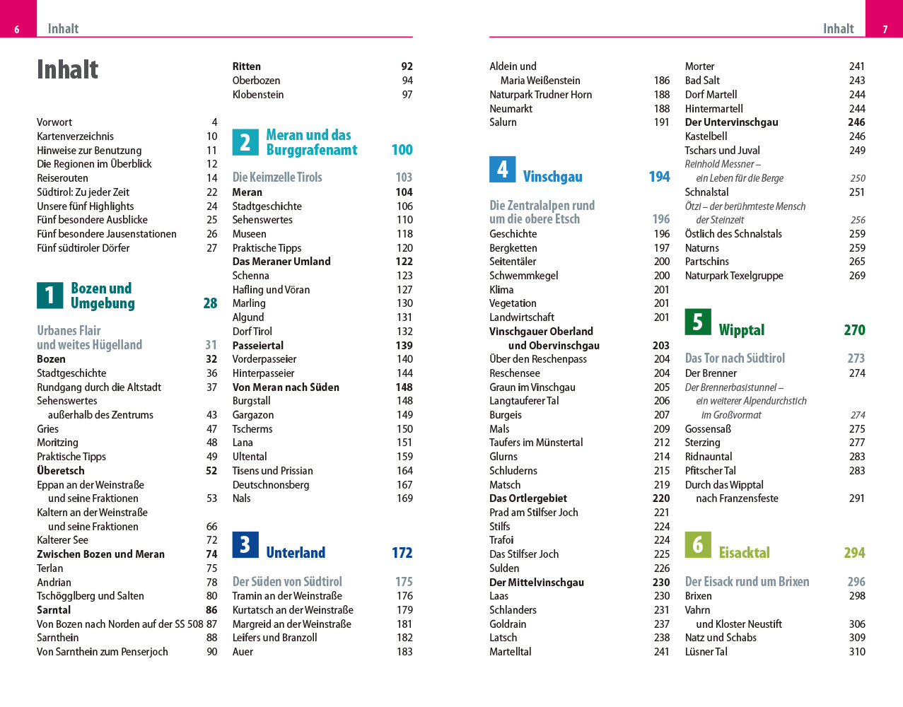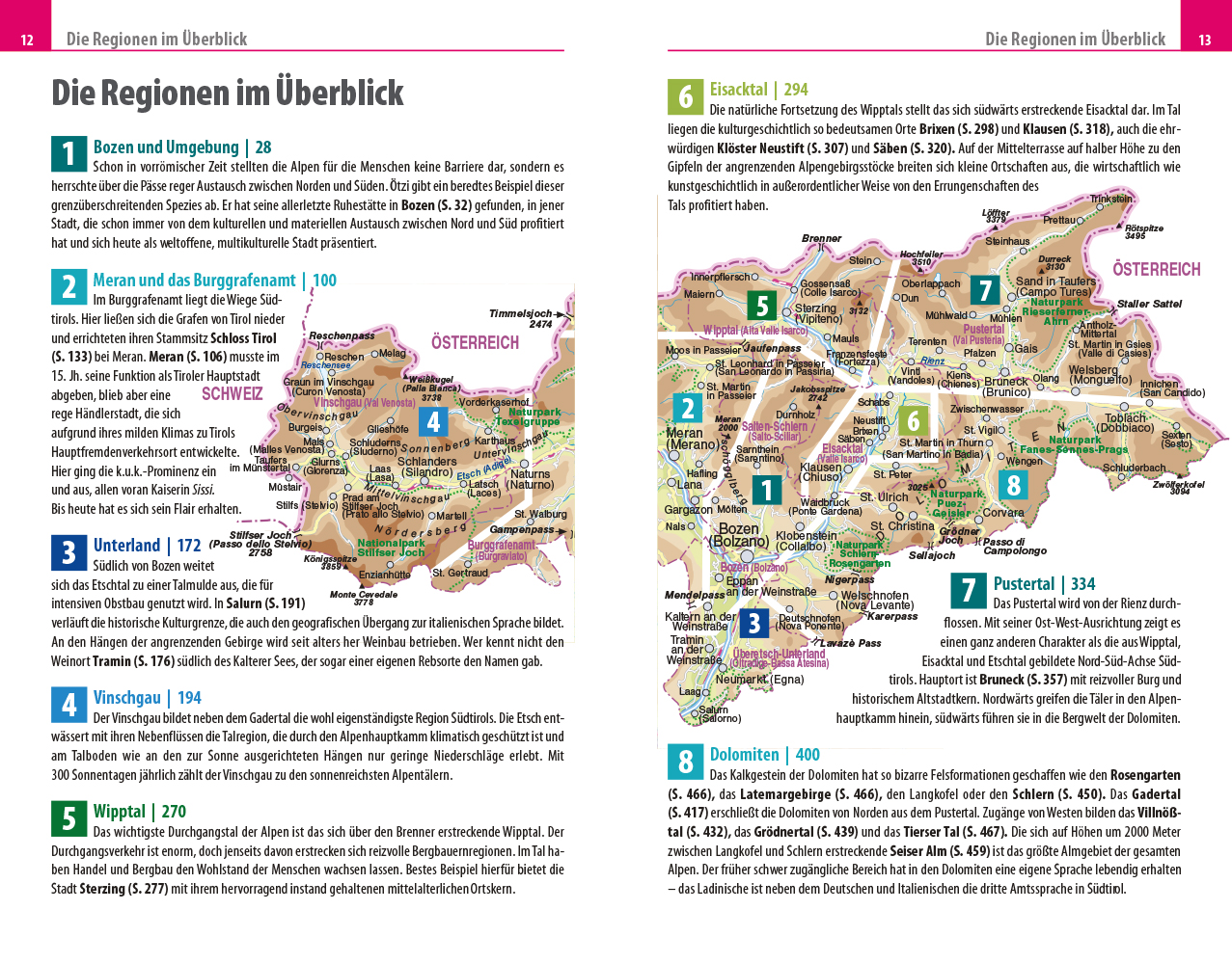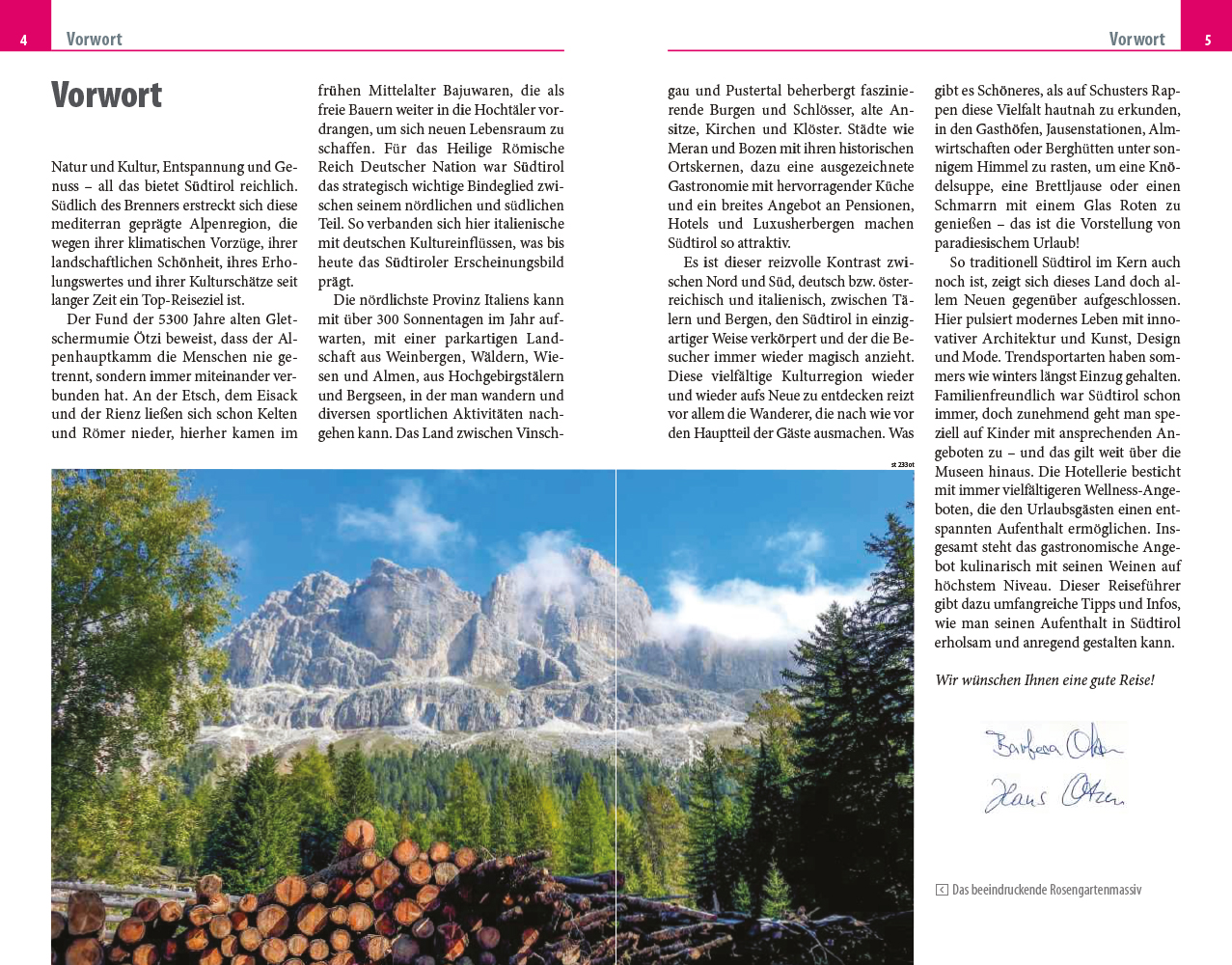 In ihrem Reiseführer beschreiben die Autoren Barbara und Hans Otzen alle interessanten Orte Südtirols: Bozen und Umgebung, Meran und das Burggrafenamt, das Südtiroler Unterland, Vinschgau, das Wipptal, das Eisacktal, das Pustertal und natürlich die Dolomiten. „Es ist dieser reizvolle Kontrast zwischen Nord und Süd, deutsch bzw. österreichisch und italienisch, zwischen Tälern und Bergen, den Südtirol in einzigartiger Weise verkörpert und der die Besucher immer wieder magisch anzieht“, so die beeindruckte Feststellung des Autorenteams.
