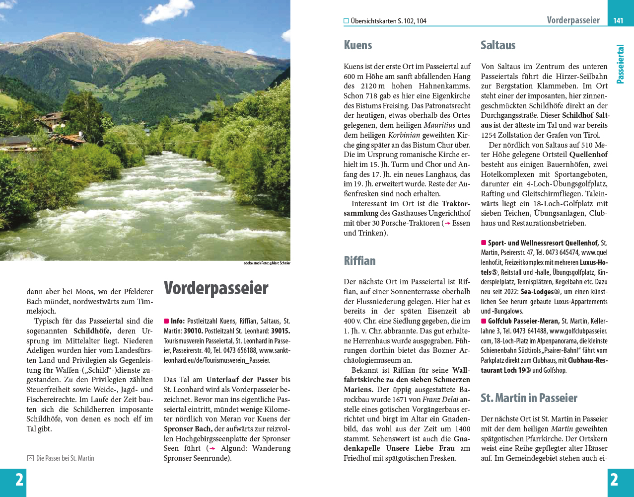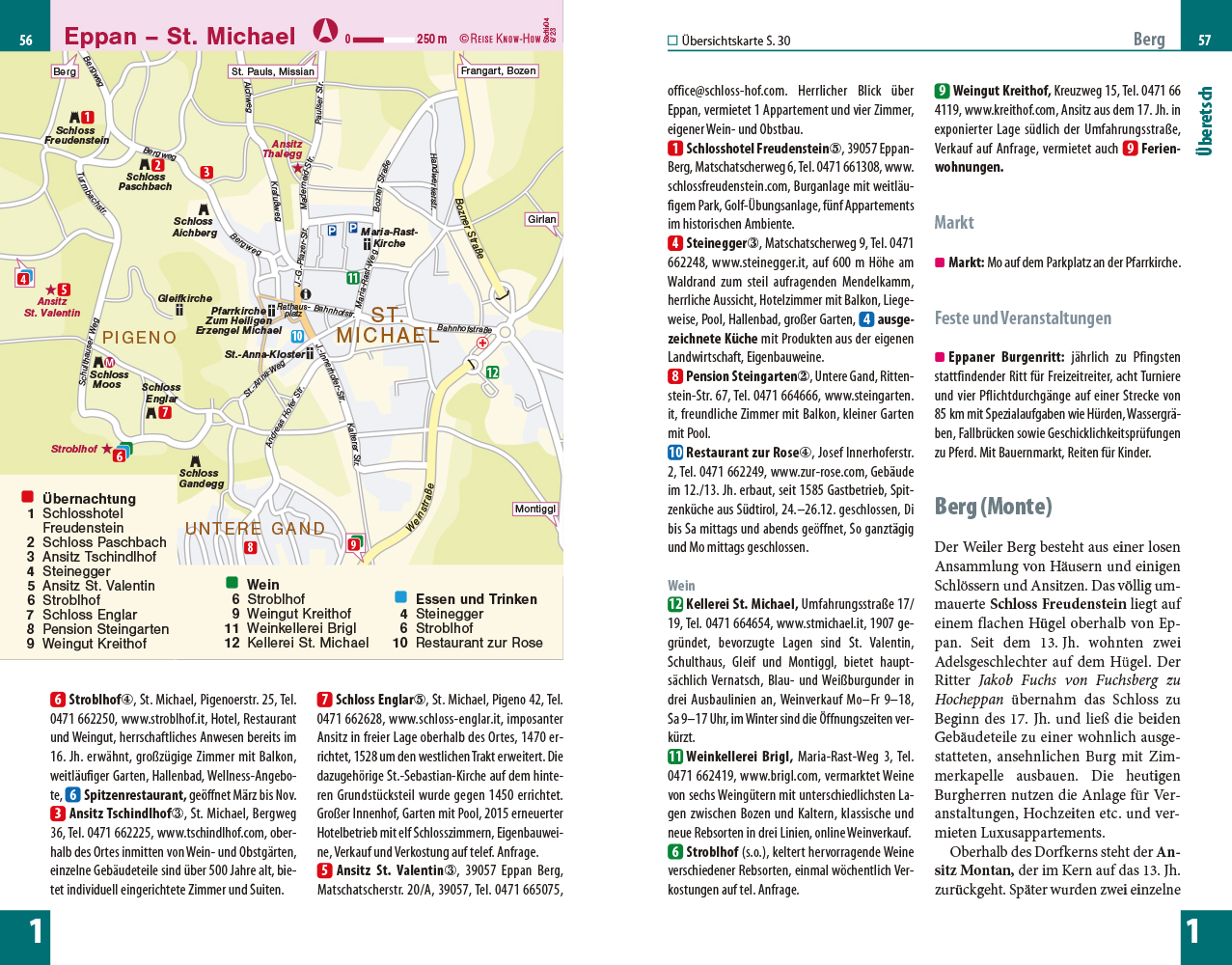 Südtirol, die nördlichste Provinz Italiens, kann mit über 300 Sonnentagen im Jahr aufwarten, mit einer parkartigen Landschaft aus Weinbergen, Wäldern, Wiesen und Almen, aus Hochgebirgstälern und Bergseen, in der man wandern und vielen sportlichen Aktivitäten nachgehen kann. Das Land zwischen Vinschgau und Pustertal beherbergt faszinierende Burgen und Schlösser, alte Ansitze, Kirchen und Klöster. Städte wie Meran und Bozen mit ihren historischen Ortskernen, dazu eine ausgezeichnete Gastronomie mit hervorragender Küche und ein breites Angebot an Pensionen, Hotels und Luxusherbergen machen Südtirol zu einem attraktiven Reiseziel.