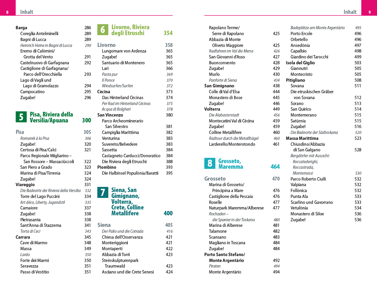 - Übersichtsseiten mit Beschreibungen aller Regionen: Florenz, Chianti, Val die Pesa, Arezzo, Lucca, Pisa, Livorno, Siena, Grosseto, Montepulciano