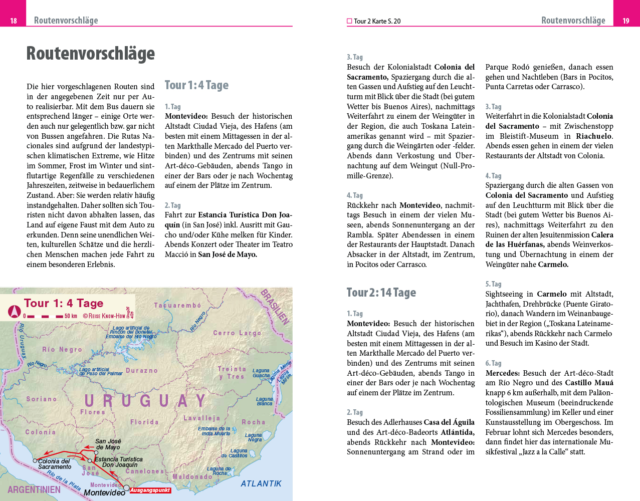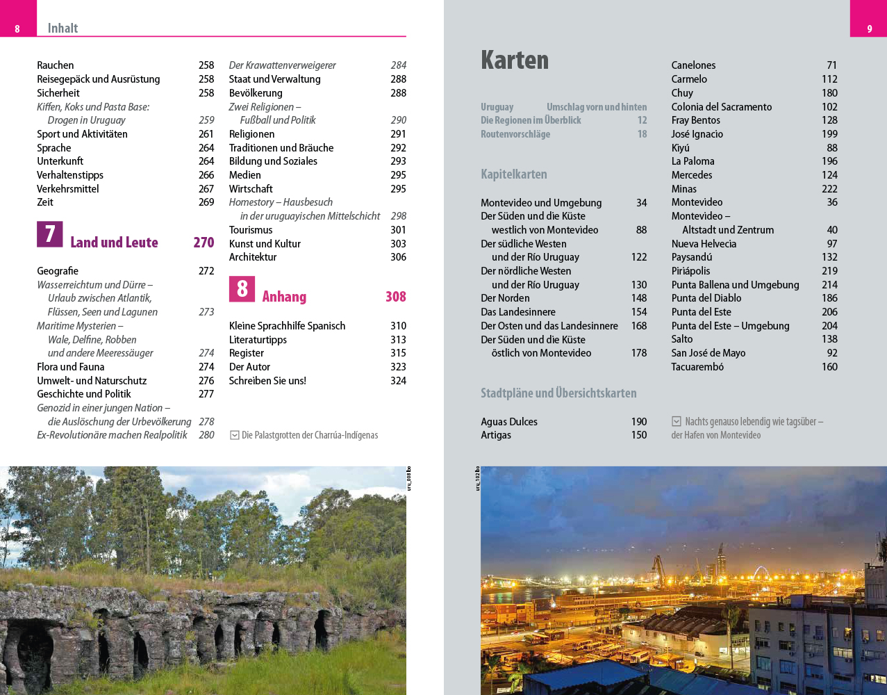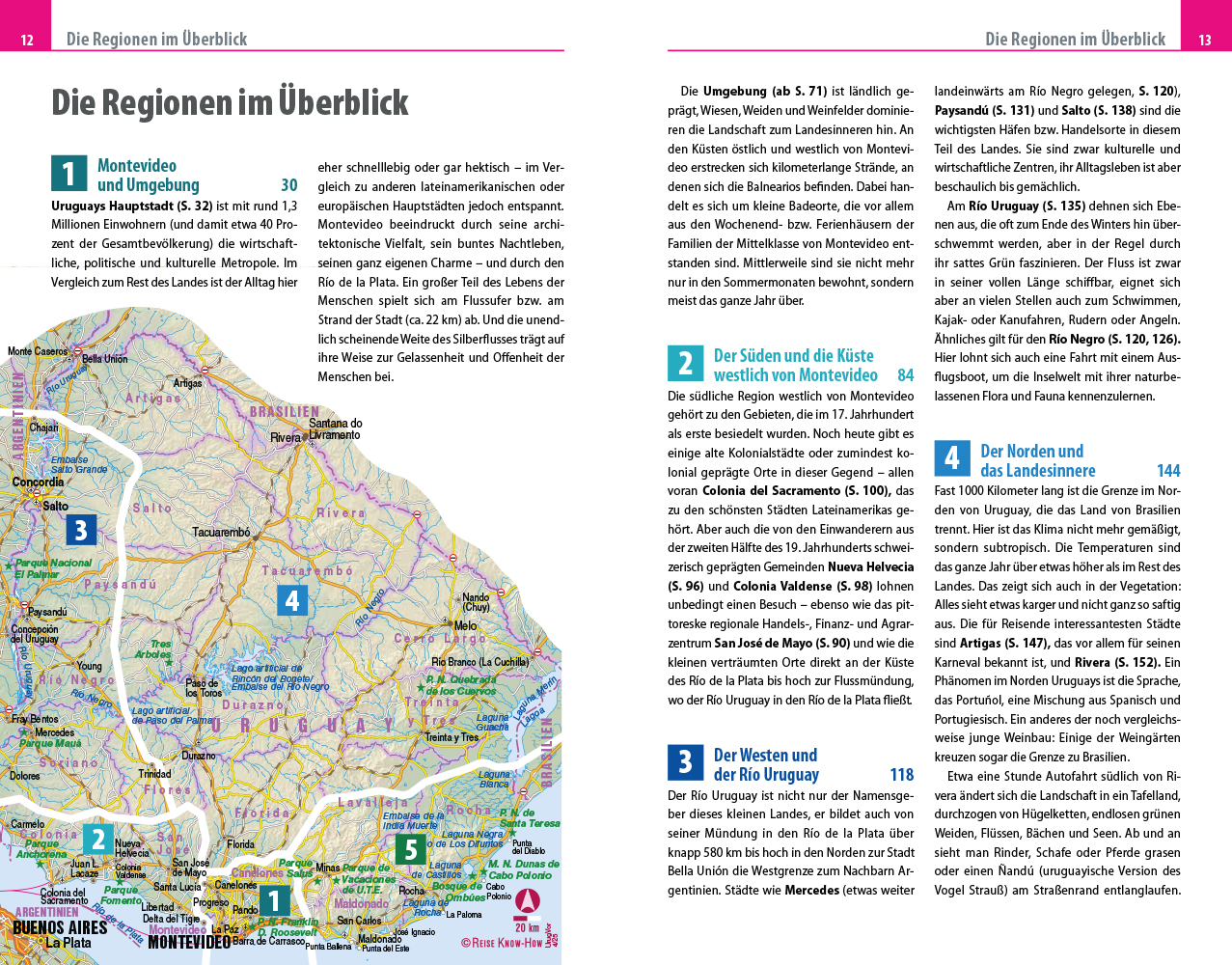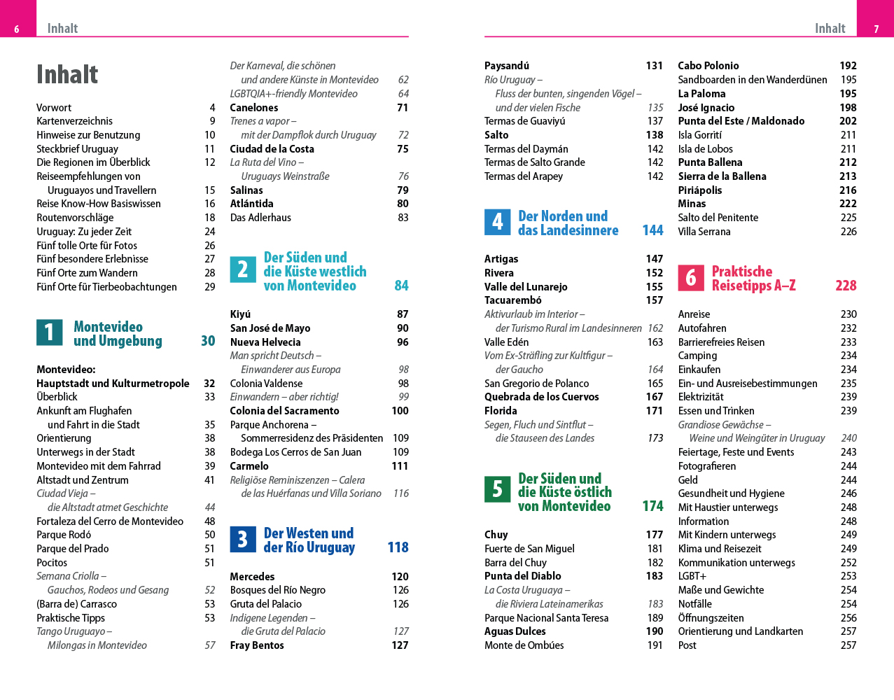 - Übersichtsseiten mit Beschreibungen aller Regionen: Montevideo und Umgebung, der Süden und die Küste westlich von Montevideo, Río Uruguay, der Norden Uruguays und das Landesinnere, der Süden und die Küste östlich von Montevideo