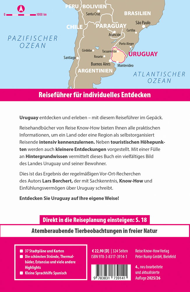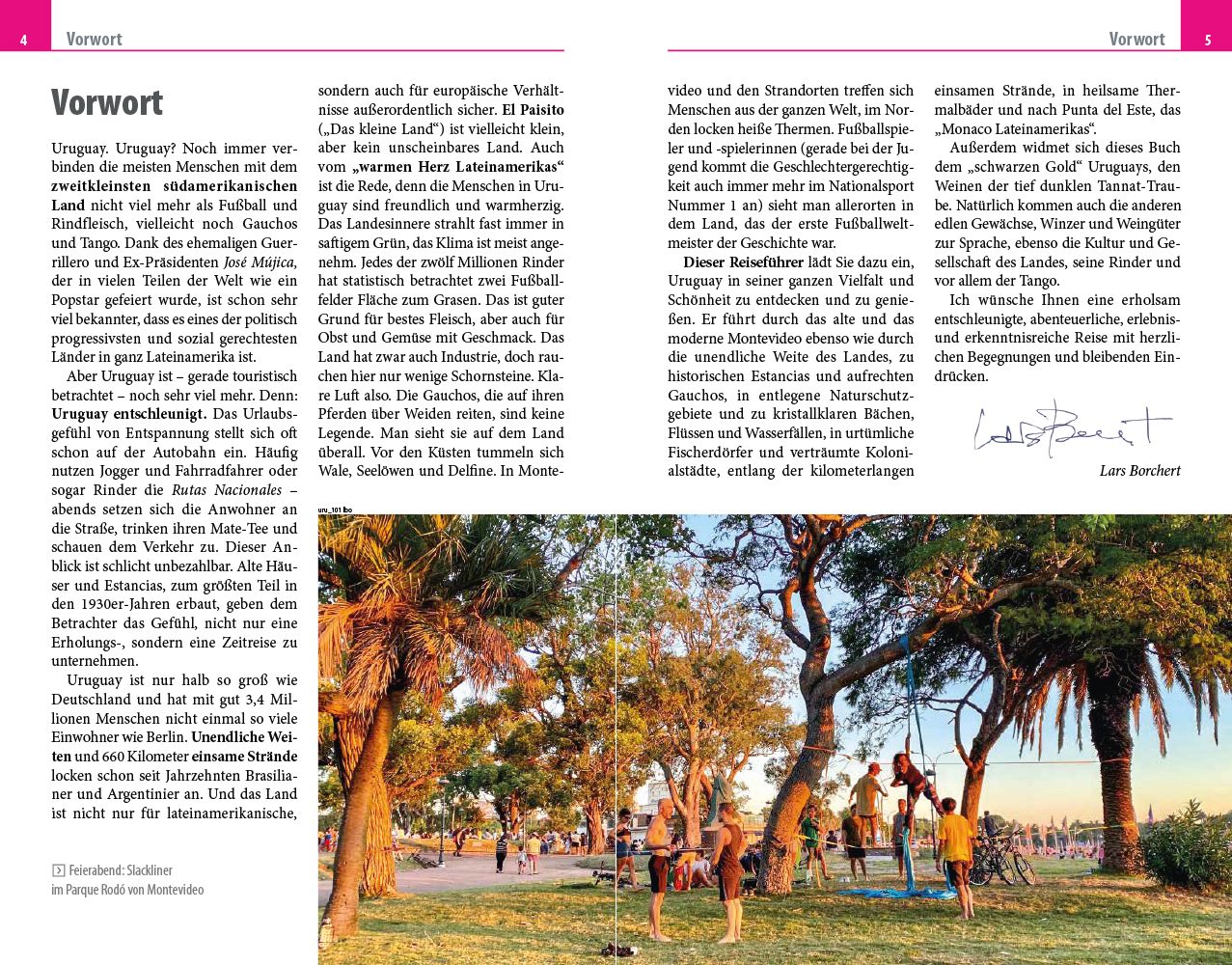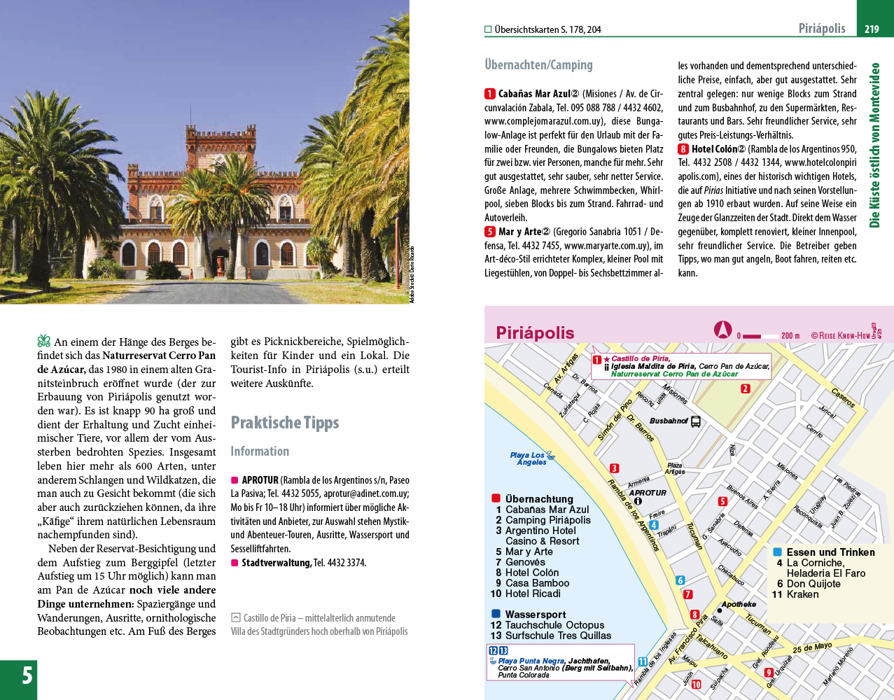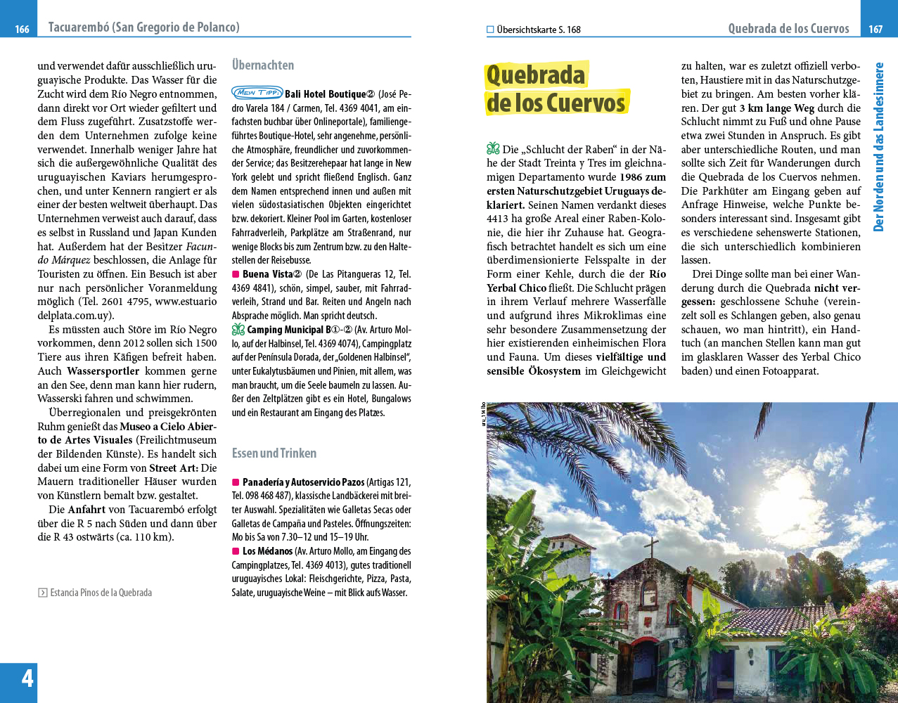 - Übersichtsseiten mit Beschreibungen aller Regionen: Montevideo und Umgebung, der Süden und die Küste westlich von Montevideo, Río Uruguay, der Norden Uruguays und das Landesinnere, der Süden und die Küste östlich von Montevideo