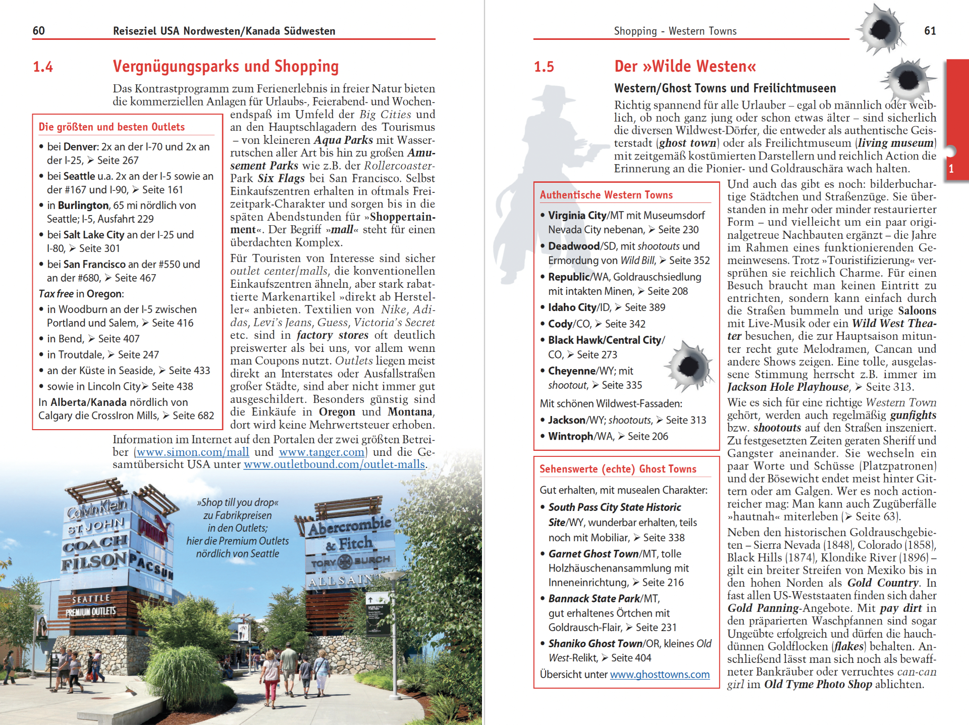 Aber: Es sind nicht nur die Städte und berühmten Nationalparks (Yellowstone, Glacier, Badlands, North Cascades u.v.m.), die für unvergessliche Reiseeindrücke sorgen, sondern auch die zahlreichen kleineren Ziele, die oft nur wenig abseits der üblichen Hauptstrecken liegen. Dazu zählen kaum frequentierte Wanderwege und Traumlandschaften, weniger bekannte Kleinode (Geisterstädtchen und Ortschaften aus der Goldrauschära in denen die Zeit stehengeblieben scheint) sowie die schönsten Spots entlang der Pazifikküste. Malerische Steilklippen und versteckte Buchten kennt man von der berühmten Oregon Coast, aber auch Nordkalifornien und die Olympische Halbinsel haben viel zu bieten. Gut verteilt über den gesamten Nordwesten laden außerdem immer wieder heiße Quellen – teils herrlich naturbelassen, teils fein erschlossen – zum Relaxen ein.
