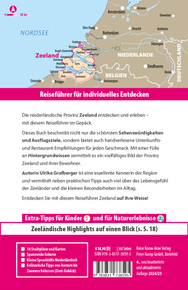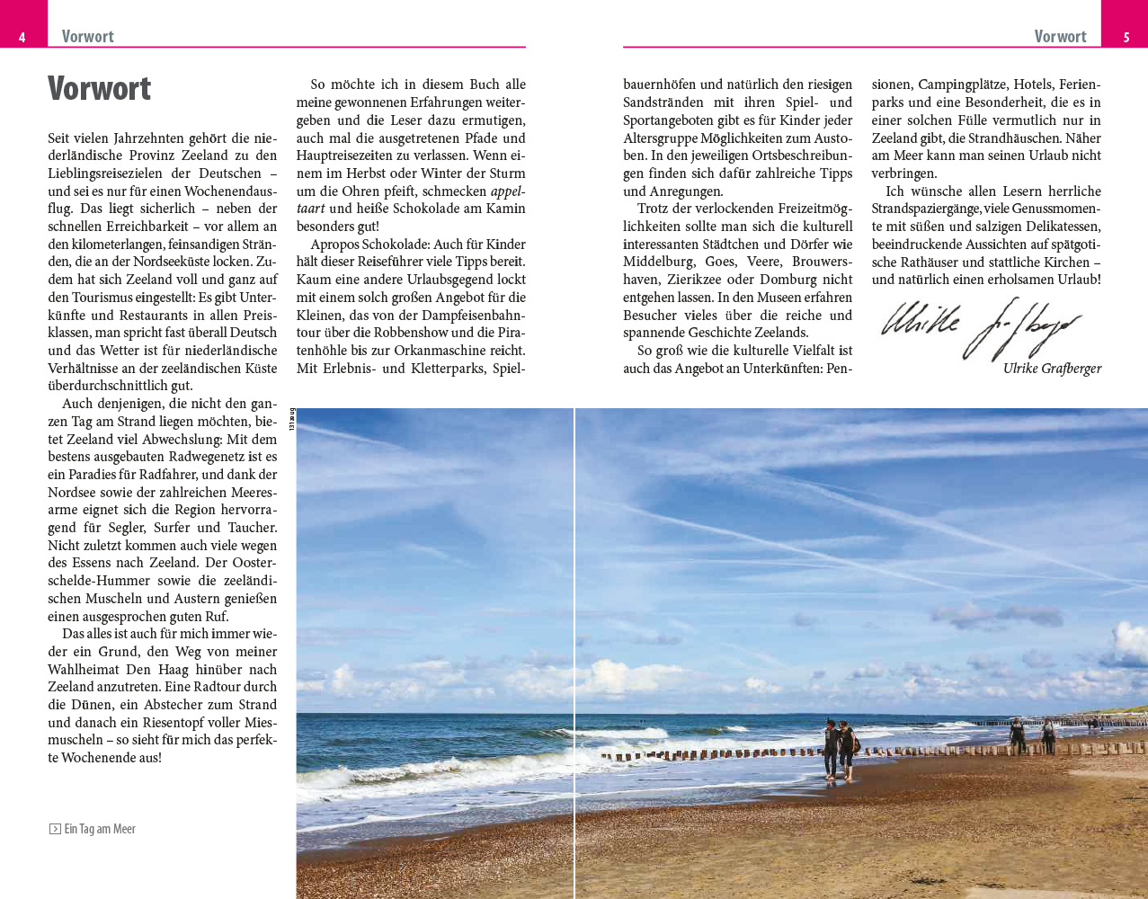Zeeland: Polderlandschaften und Dünengebiete gehen über in endlos lange Strände, die zum Spazierengehen und Sonnenbaden einladen, idyllische Hafenstädtchen wie Veere und Brouwershaven oder die historische Stadt Middelburg sorgen für kulturelle Abwechslung, und an keinem anderen Ort der Niederlande scheint die Sonne so häufig wie hier. Die erfahrene Niederlande-Autorin Ulrike Grafberger lebt seit 17 Jahren an der Küste. In ihrem Reiseführer Zeeland nimmt sie die Leserinnen und Leser mit zu Radtouren durch die Dünen, zu den Fundplätzen fossiler Haifischzähne, in eine begehbare Orkanmaschine sowie zu Ferienhäusern, die nicht am, sondern mitten auf dem Strand stehen.