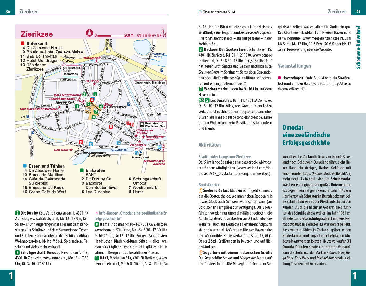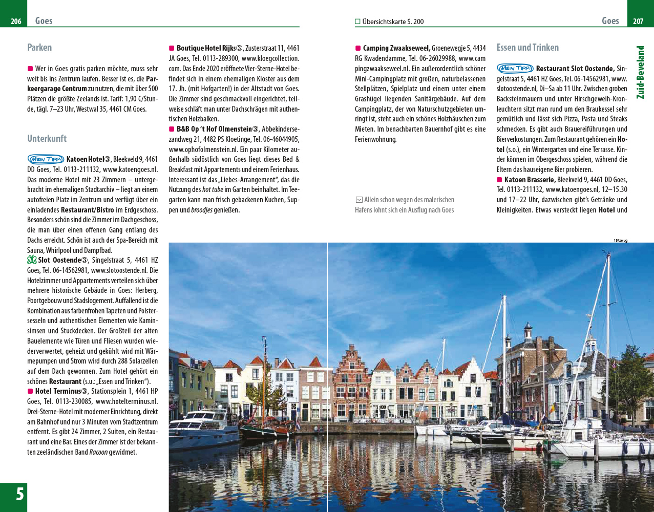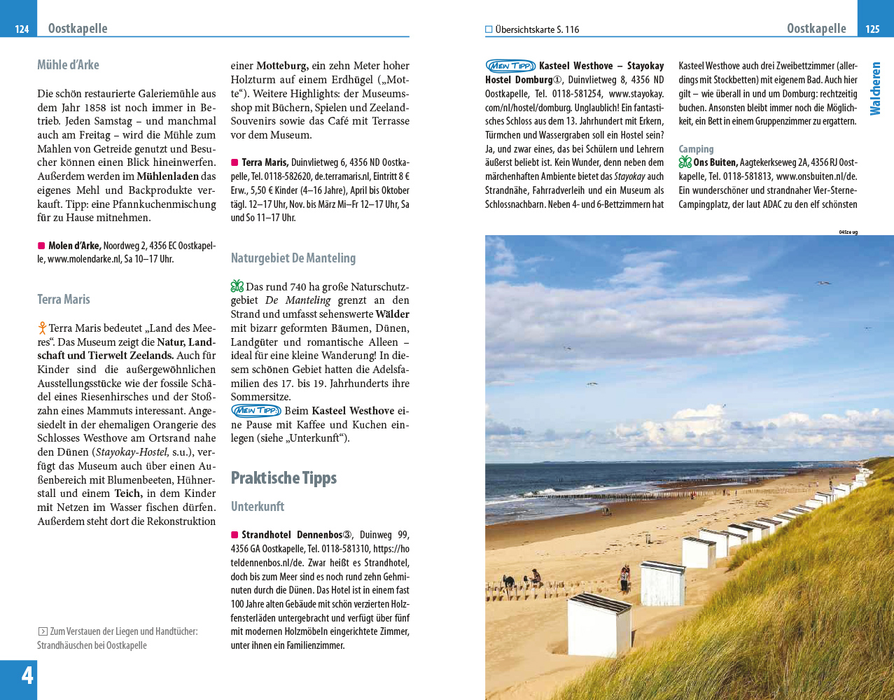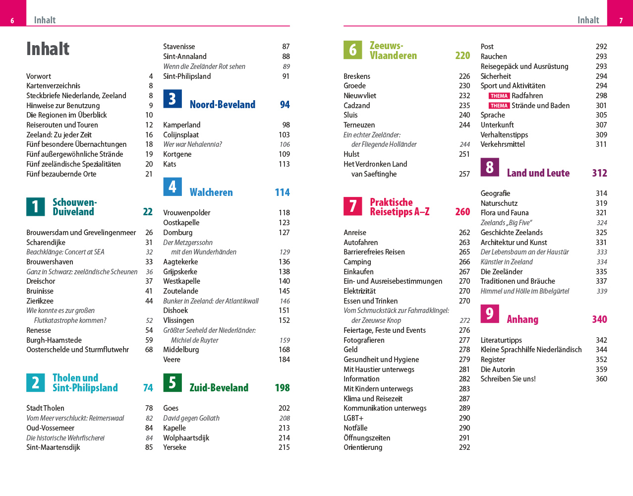 - Übersichtsseiten mit Beschreibungen aller interessanten Orte Zeelands: Von Schouwen-Duiveland über Tholen und Sint-Philipsland, Noord-Beveland, Walcheren und Zuid-Beveland bis nach Zeeuws-Vlaanderen