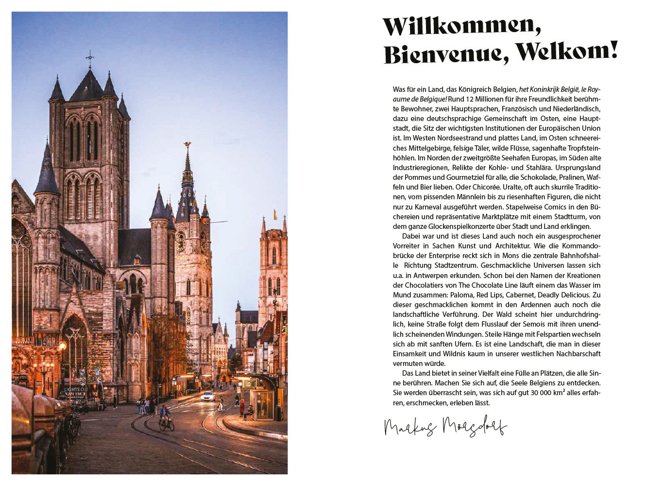 Die schroffen, felsigen Ardennen im Osten, in die sich tiefe Flusstäler eingegraben haben, tiefe, dunkel-geheimnisvolle Wälder voller Legenden und mystischer Stimmungen, in denen sich Hirsch, Luchs und Wildschwein gute Nacht sagen, ein kurzer Streifen umwerfend schönen Nordseestrands und eine wunderschöne Kunststadt nach der anderen: All diese Orte und Erlebnisse tragen die Seele Belgiens in sich, eines Landes, in dem jede Region ihren eigenen Charakter hat, voller Vielfalt, Kultur und wilder Natur.