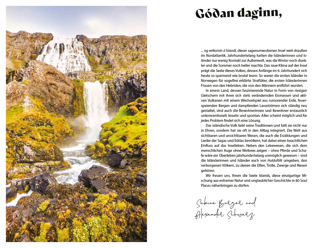 80 dieser Soul Places haben die Autoren, Fotografen und Wahl-Isländer Alexander Schwarz und Sabine Burger zusammengestellt. Sie alle fangen die besondere Atmosphäre des Landes ein, bringen die Heimat der Kobolde und Elfen näher und haben das Zeug zu neuen Lieblings- und Sehnsuchtsorten: Von den heißen Quellen am Reykjadalur über einen Torfbauernhof aus dem 16. Jahrhundert bis hin zur Hallgrímskirkja, der größten Kirche des Landes.