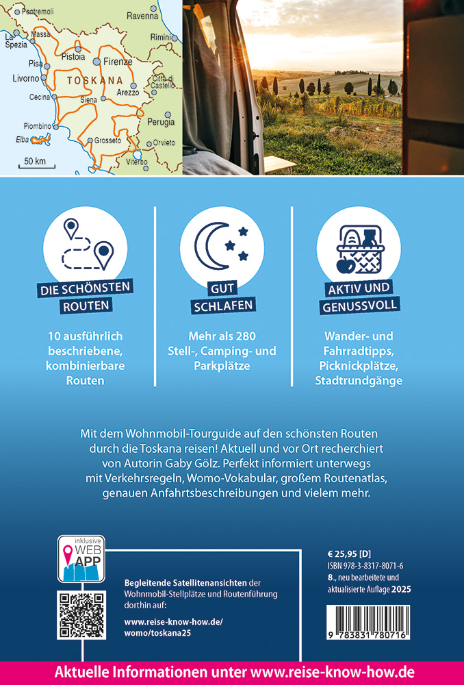 Die Autorin Gaby Gölz, erfahrene Journalistin, Italienkennerin und begeisterte Wohnmobilfahrerin, führt fachkundig durch die schönsten Regionen der Toskana – mit Tipps zu Sehenswürdigkeiten, Outdoor-Aktivitäten, kulinarischen Highlights und vielem mehr.